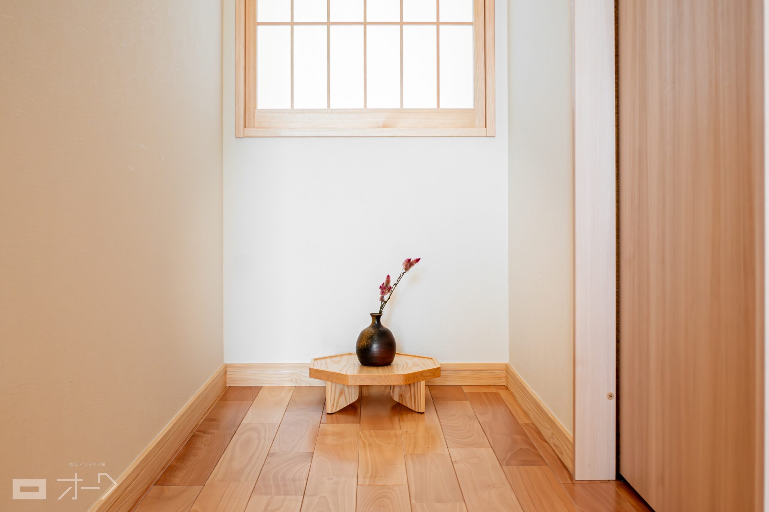 アイキャッチとなるスペースには、アッシュ(タモ)無垢材のお盆もお選びいただきました。シンプルなデザインの小ぶりな家具ですが、それゆえに品質の良さが際立ちます。季節のお花や、お気に入りの小物などをディスプレイするのも、粋なインテリアを楽み方ですね。