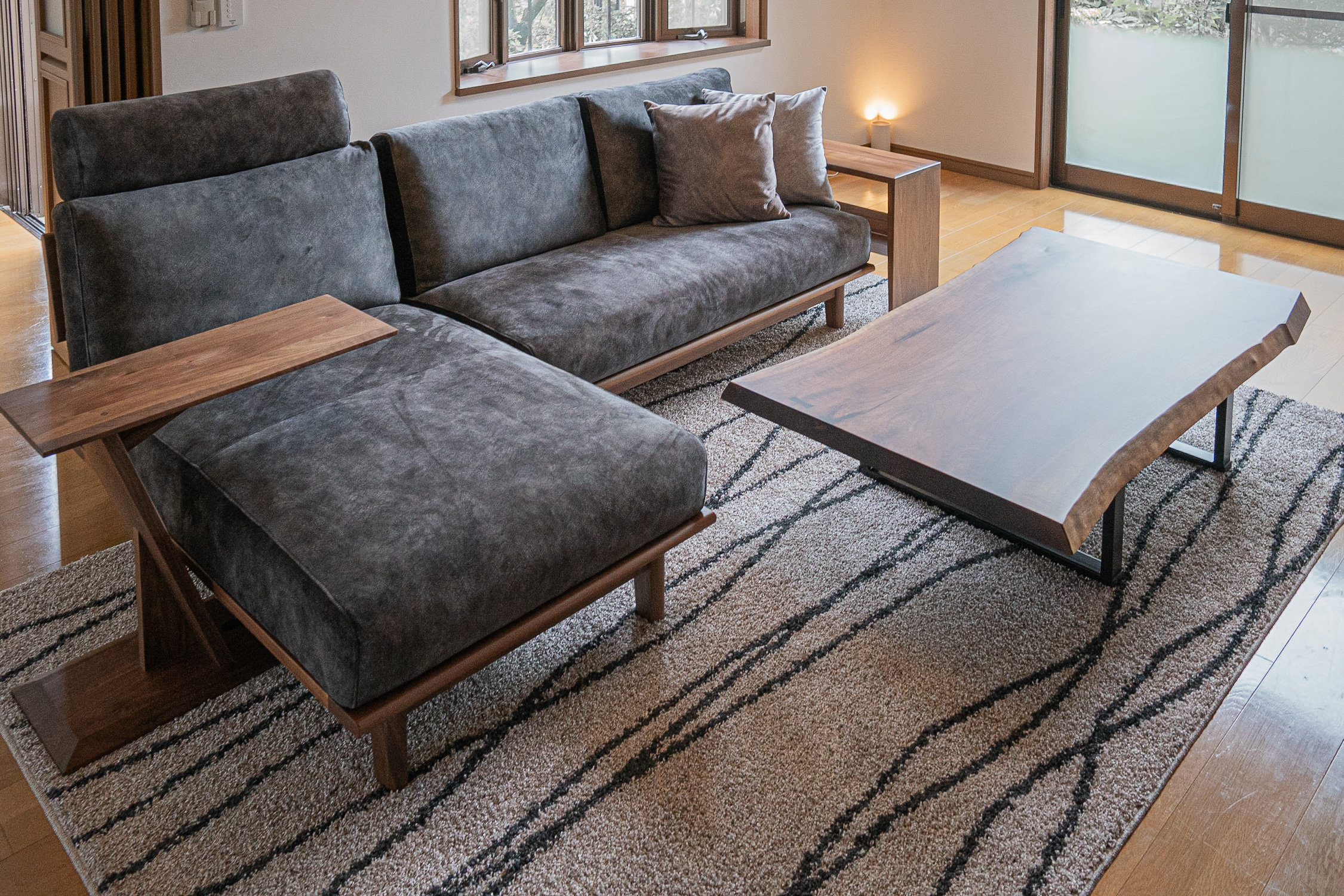ブラックウォールナット無垢材のソファと一枚板のセンターテーブルをお届けしました。カウチタイプに幅広のアームテーブルを合わせていただき、リラックス度満点の組み合わせです。そしてなんと言っても一枚板のセンターテーブル!ダイニングテーブルとしても使えるサイズを贅沢に使い、豪華な空間に仕上がりました。