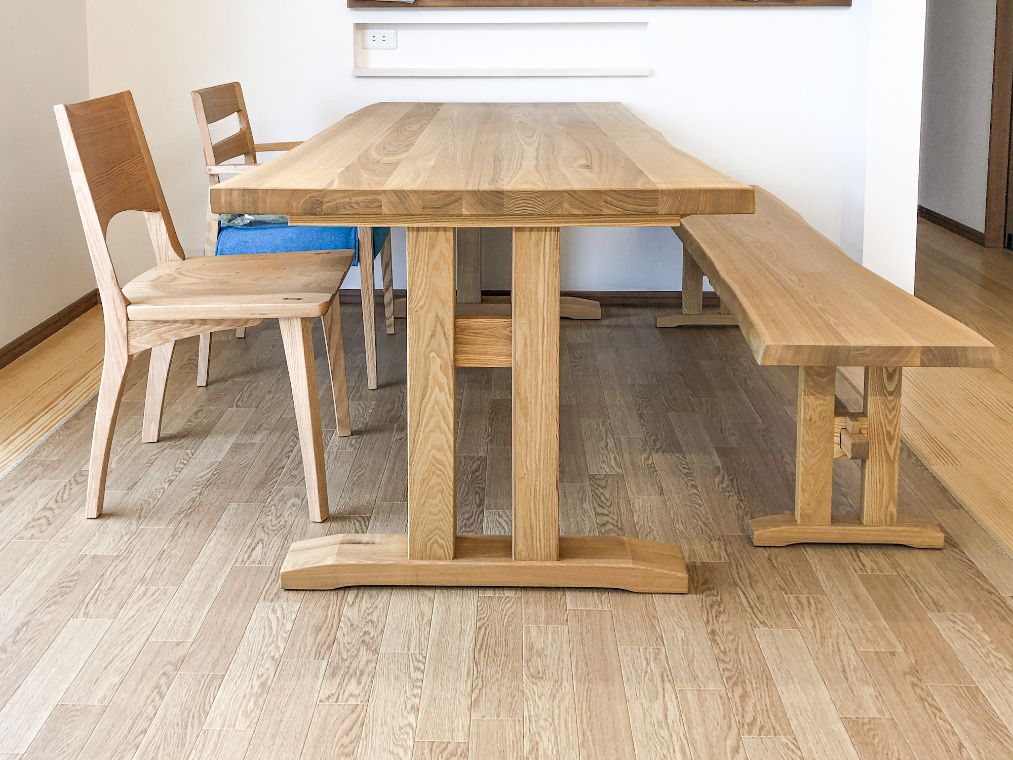 タモ(アッシュ)無垢材のダイニングセットをお届けしました。椅子は板座とカバーリングを組み合わせていただき、ベンチはテーブルと同じく耳付きの板を使ったタイプをお選びいただきました。無垢材ならではの自由な組み合わせを楽しんでいただけるセットになりました。厚みのある天板も迫力があって格好いいですね!