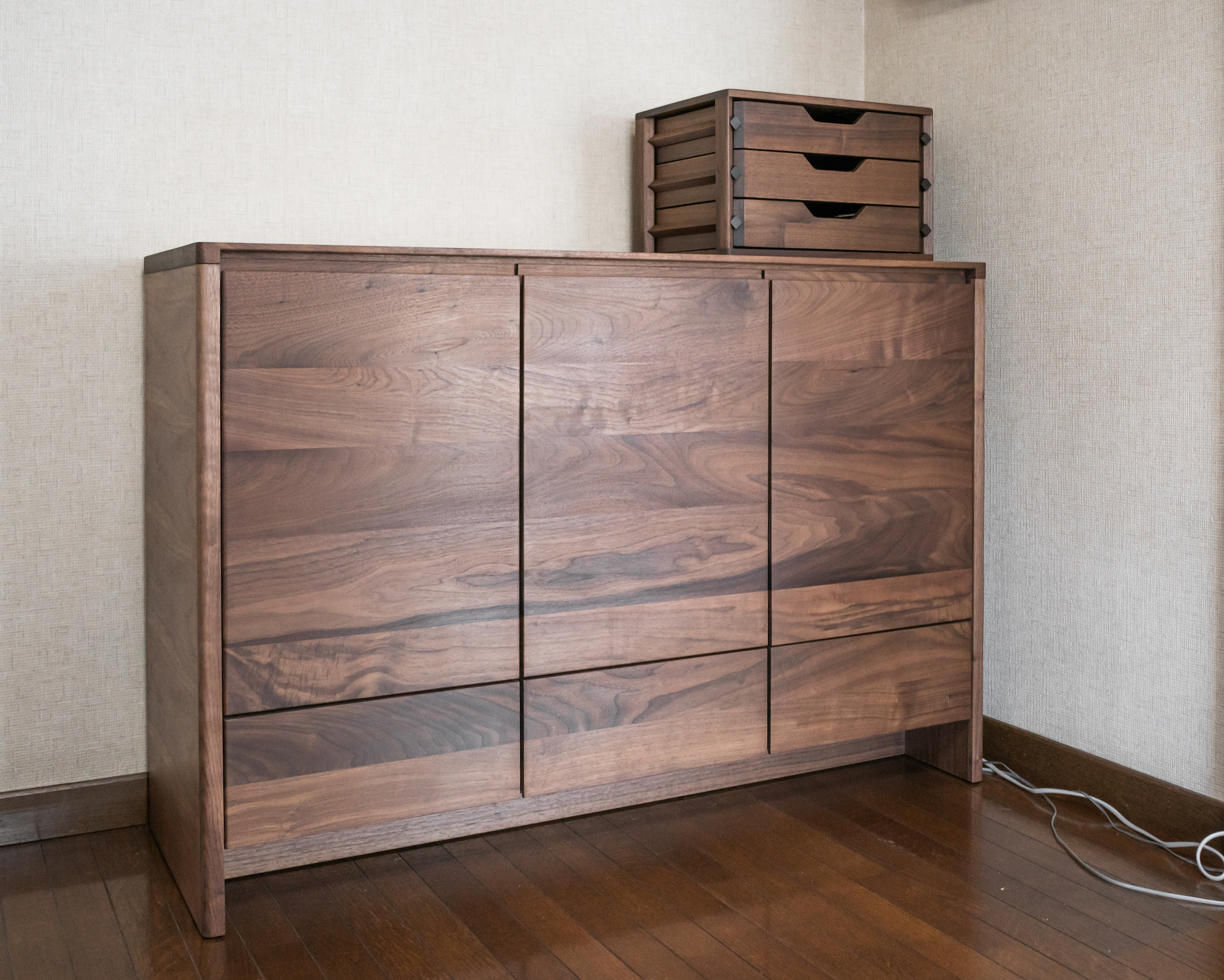 ブラックウォールナット無垢材のサイドボードをお届けしました。すっきりしたシルエットながら、左右に木目が繋がった扉・前板が存在感抜群です!同素材の書類ケースも合わせてご用意させていただき、贅沢な印象の一角に仕上がりました。
