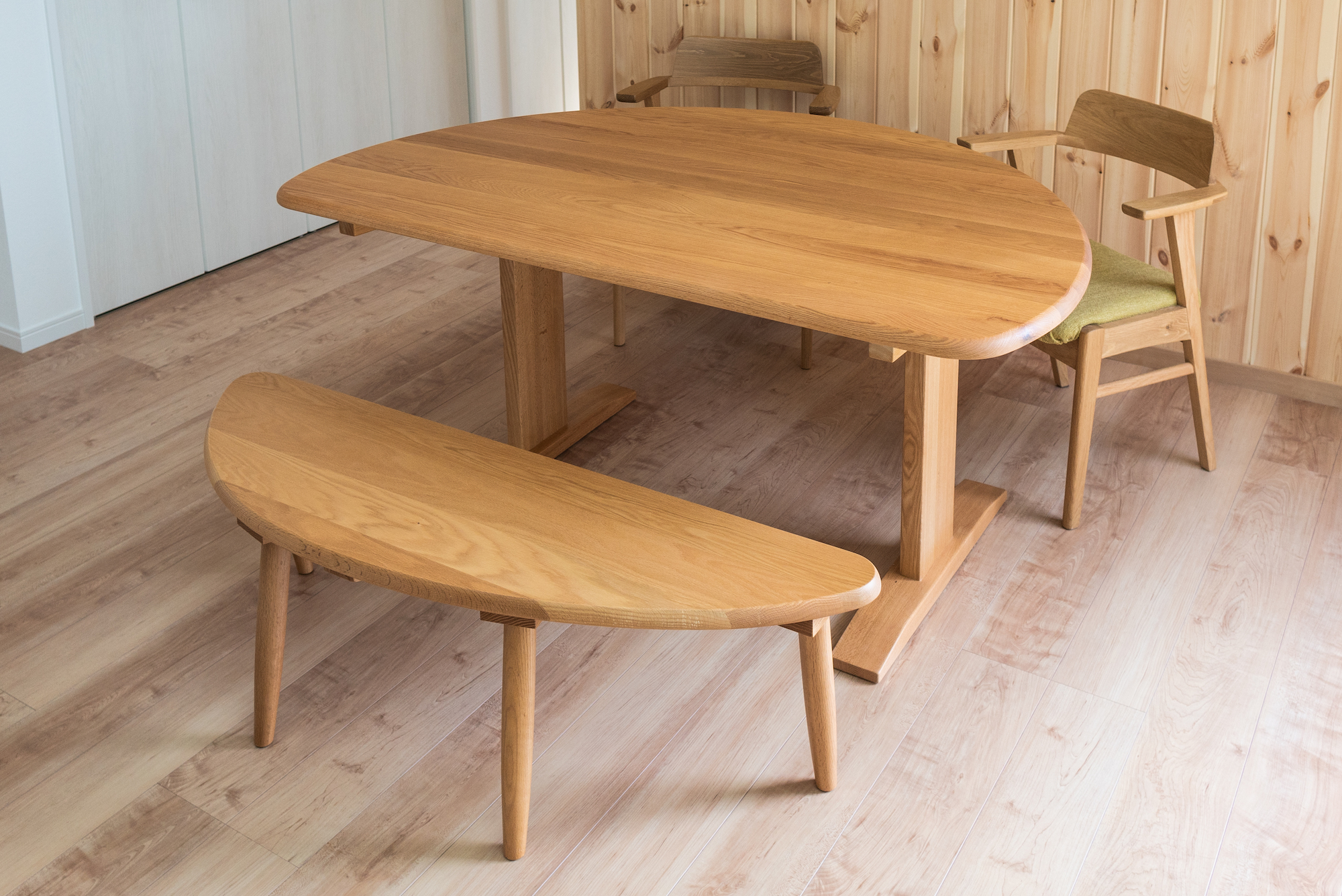 ナラ(オーク)無垢材のダイニングテーブルをお届けしました。円を2/3にカットした形状が目を引く天板は、2・3人〜最大7人まで使えるフレキシブルさも魅力です。セットのベンチと組み合わせると、面白みが格段にアップ!お手持ちの椅子との相性もばっちりですね。