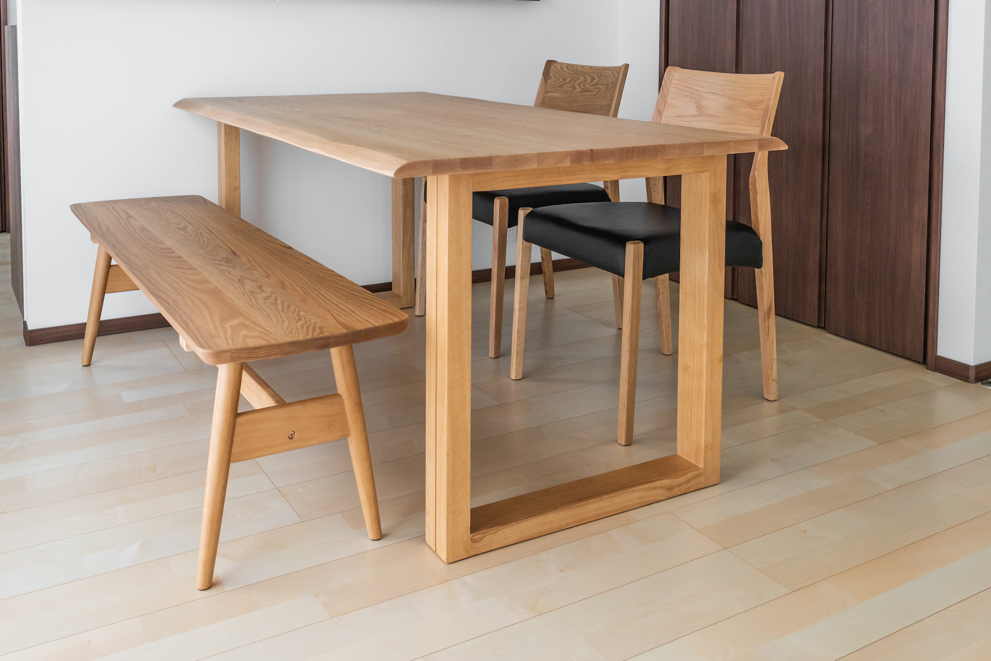 ナラ(オーク)無垢材のダイニングセットをお届けしました。天板は削り出し加工を施して、無垢材の質感をたっぷり味わえます。ベンチは少し丸みのあるタイプをお選びいただき、優しい印象になりました。