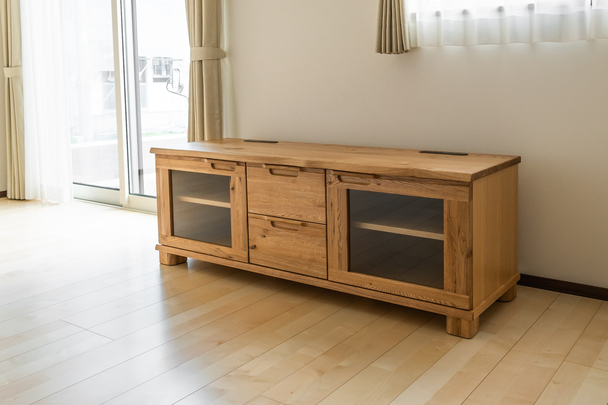 リビングスペースにも、同じくナラ(オーク)無垢材のテレビボードをお選びいただきました。厚みのある天板で、こちらも迫力があります。大ぶりなサイズで収納力がたっぷり確保できるのも嬉しいポイントです。