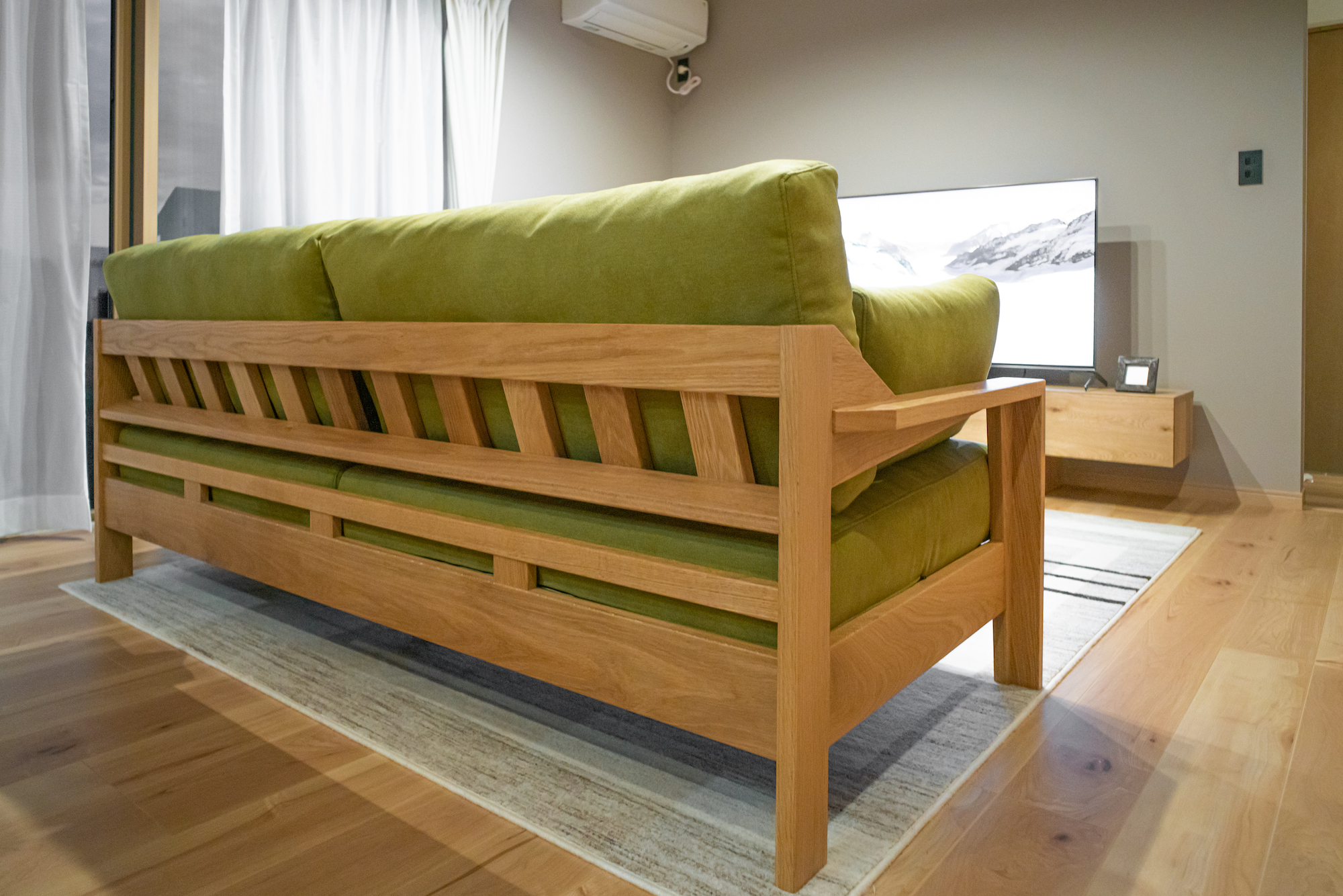 ナラ(オーク)無垢材のソファをお届けしました。幅2000ミリというゆったりしたサイズ感に、こちらの背もたれの仕様はやはり圧巻!高品質な無垢材をふんだんに用いており、迫力と高級感がたっぷり味わえます。カバーは淡いグリーンで合わせていただき、ナチュラルで綺麗な組み合わせに仕上がりました。