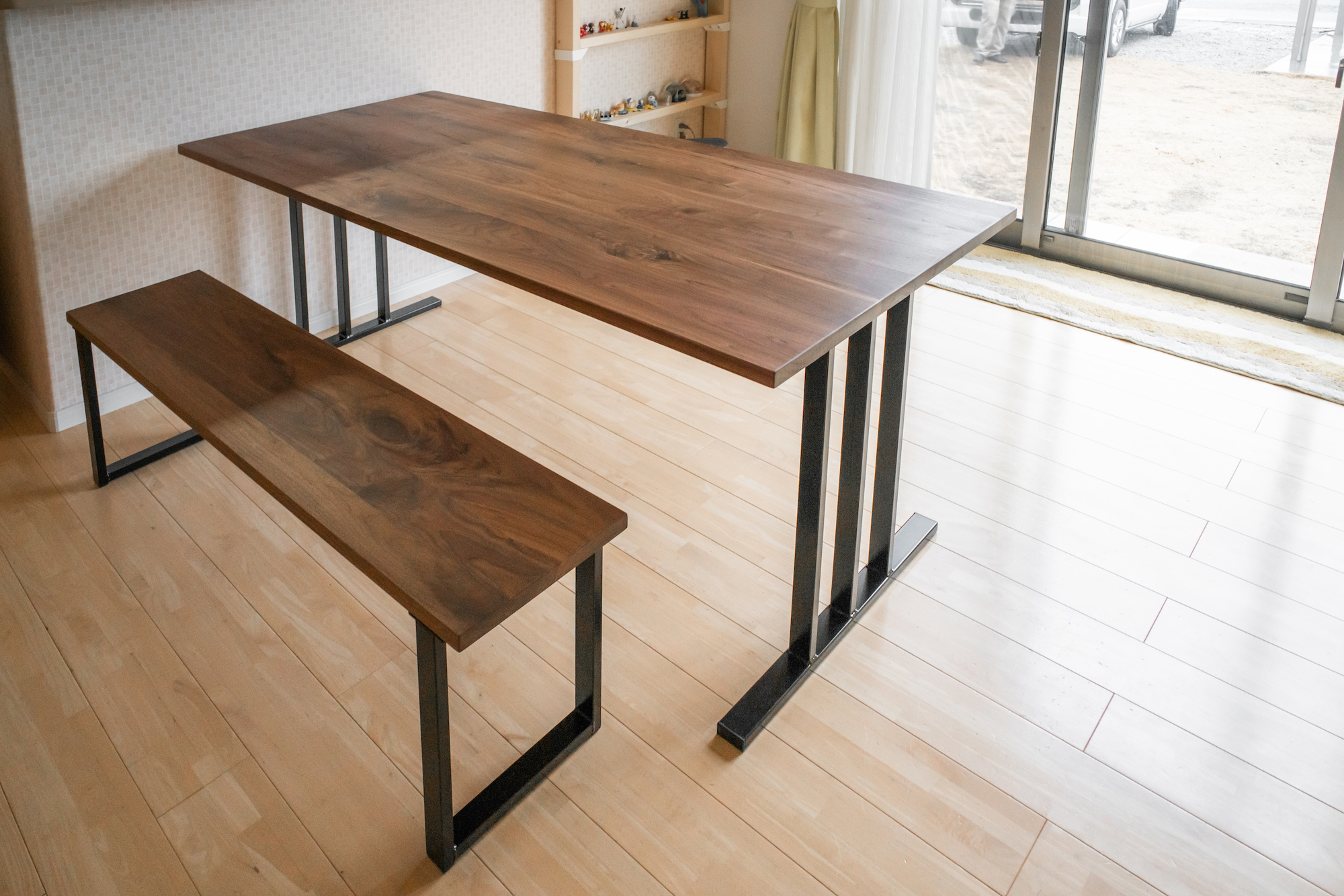 ブラックウォールナット無垢材のダイニングテーブル&ベンチをお届けしました。シャープな天板にスチール脚の組み合わせがよく似合います!明るい色合いのお部屋とのコントラストも引き締まっていて素敵ですね。