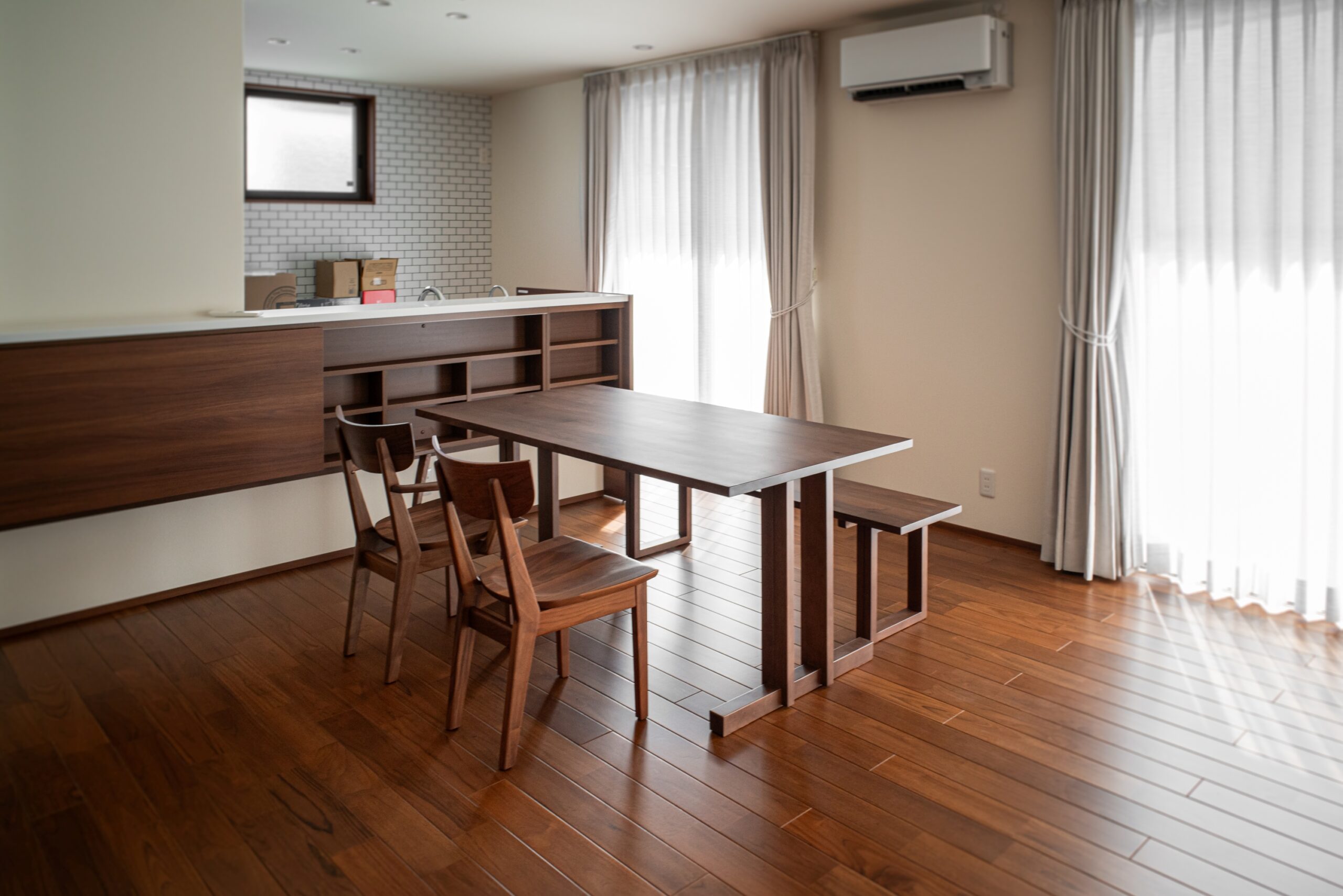 ブラックウォールナット無垢材のダイニングセットをお届けしました。ダーク色のフローリングに合わせた重厚感・高級感もありつつ、大きめの開口部と明るい内装材との組み合わせが綺麗なコントラストのある空間になりました。椅子は同一のデザインで肘あり&肘なしを1脚ずつお選びいただき、統一感のある組み合わせです。