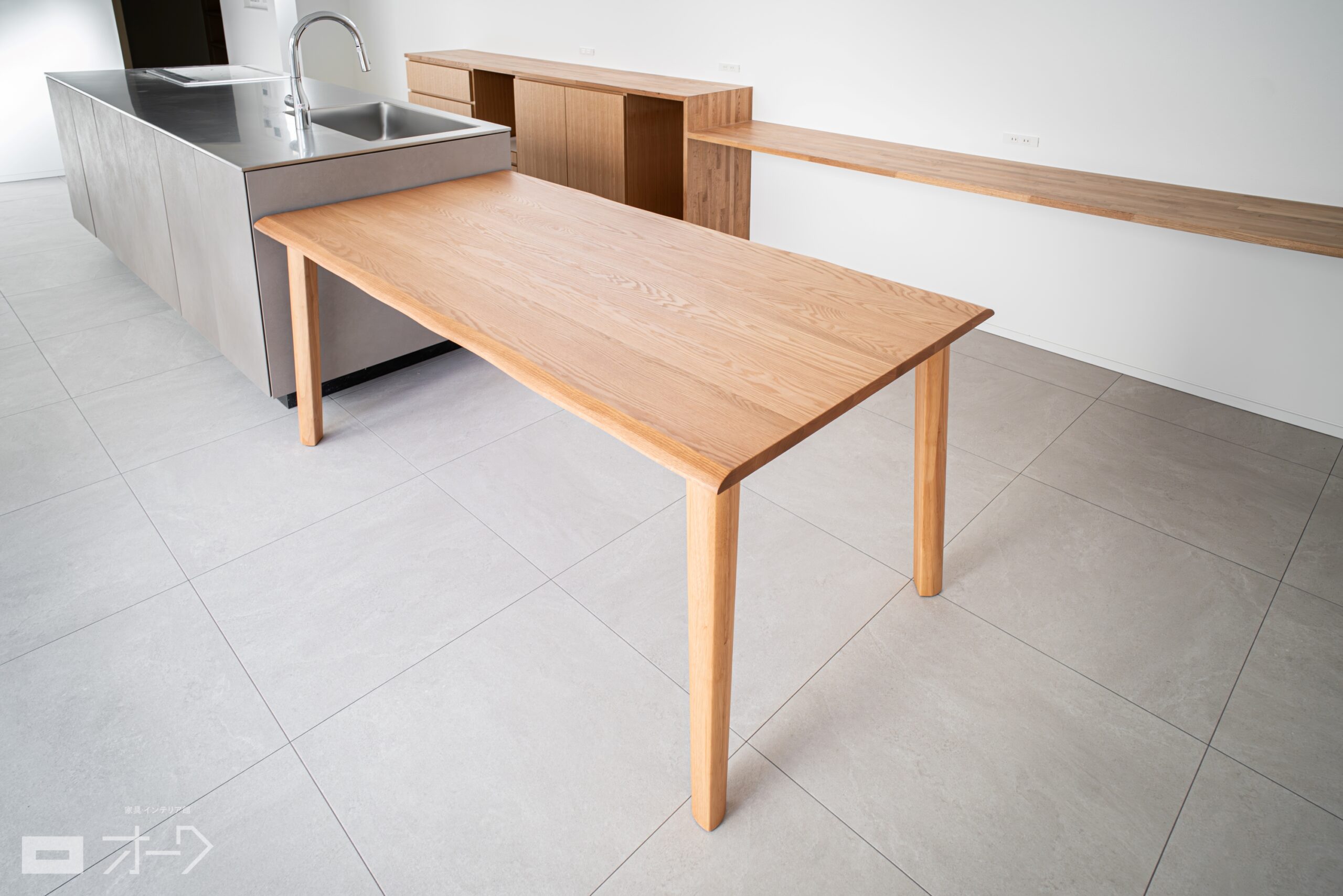 ナラ(オーク)無垢材のダイニングセットをお届けしました。広々としたスペースを活かして幅1800ミリの大判サイズをお選びいただき、大型のキッチンに見合う迫力の一枚に仕上がりました。