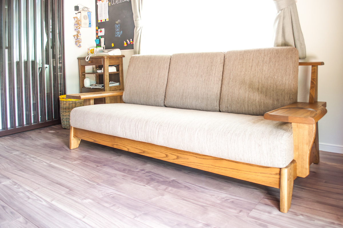 タモ(アッシュ)無垢材のソファをお届けしました。横幅2メートルを超える特大サイズで、大人3人でもゆったり寛げます。無垢材を削り出した平面が特徴的な肘掛けは、TVのリモコンやコーヒー、ちょっとしたお菓子を置いておくスペースとして。リビングスペースの“顔”として相応わしい貫禄がありますね!