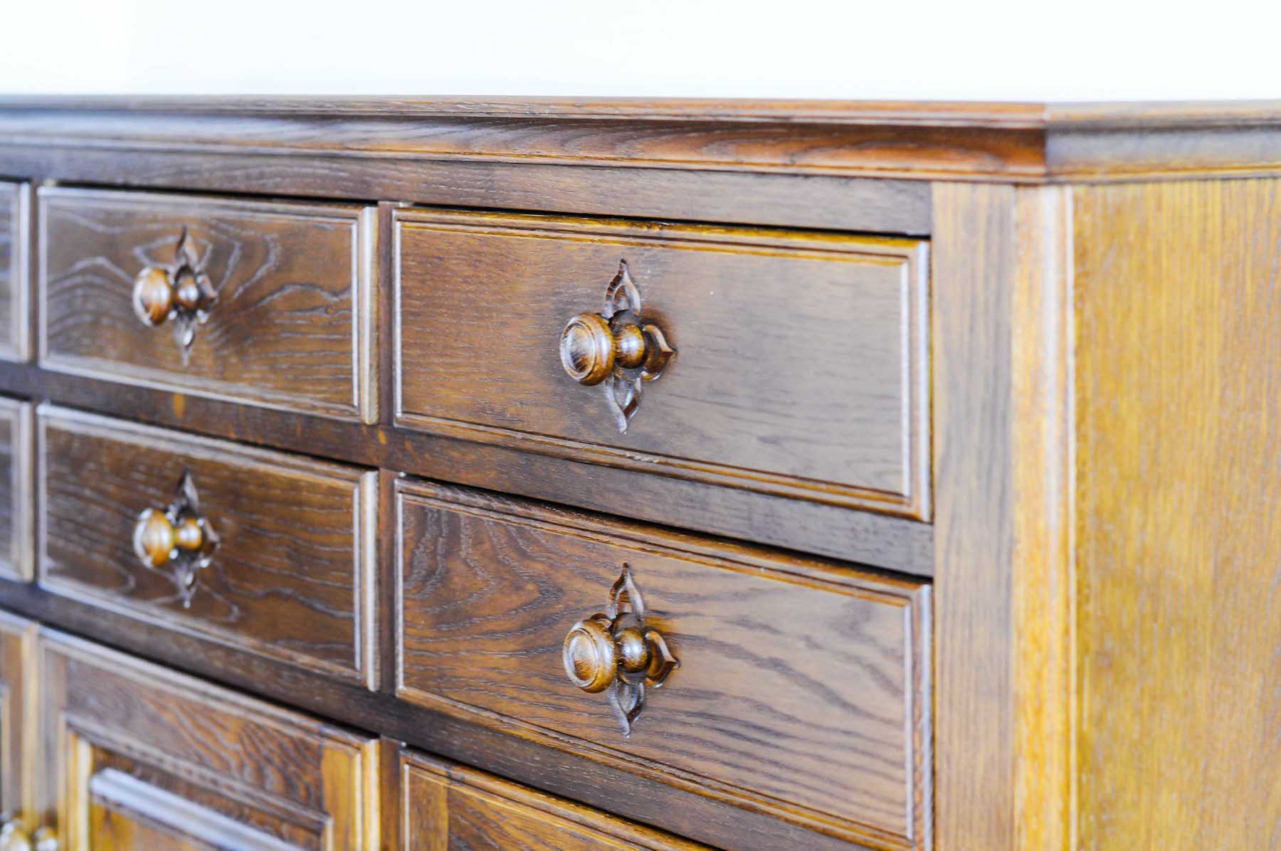 引き出しの取っ手部分には花柄の彫刻を施しています。