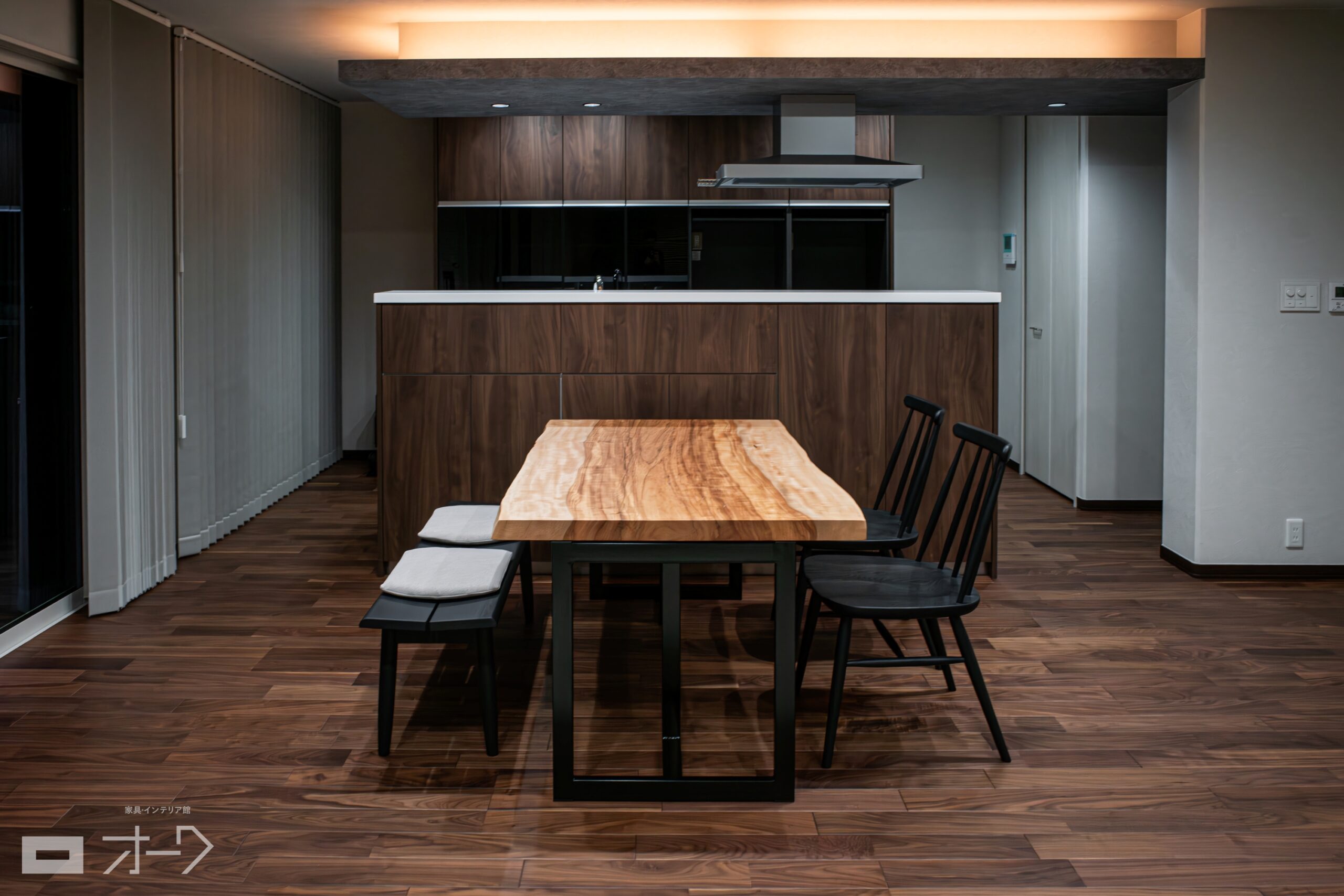 栃(トチ)一枚板のダイニングテーブルをお届けしました。ねじれながら成長する栃特有の縮み杢が、何重にも美しく入った貴重な一枚です。脚はシンプルなスチールタイプで合わせ、椅子とベンチもブラック塗装をお選びいただくことで、栃の白さが一層際立つ組み合わせに仕上がりました。