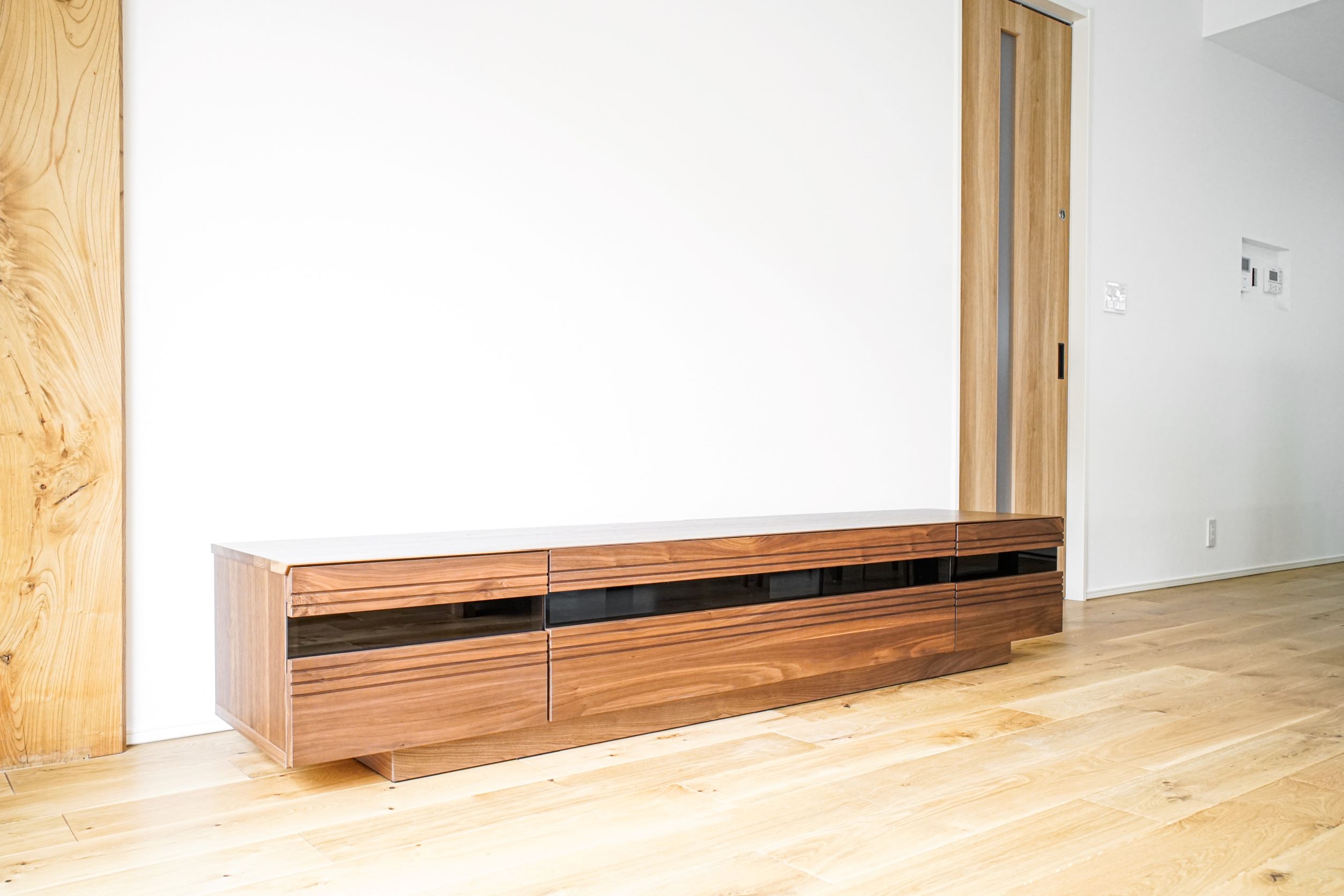 ブラックウォールナット無垢材のテレビ台をお届けしました。幅2200ミリの大判サイズに加えて、横方向に入ったスリットとブラックガラスが視線を誘導することで実際以上にボリュームを感じられるデザインが人気の一品です。明るい空間に、高級感のあるブラックウォールナットの色合いが良く似合っていますね。