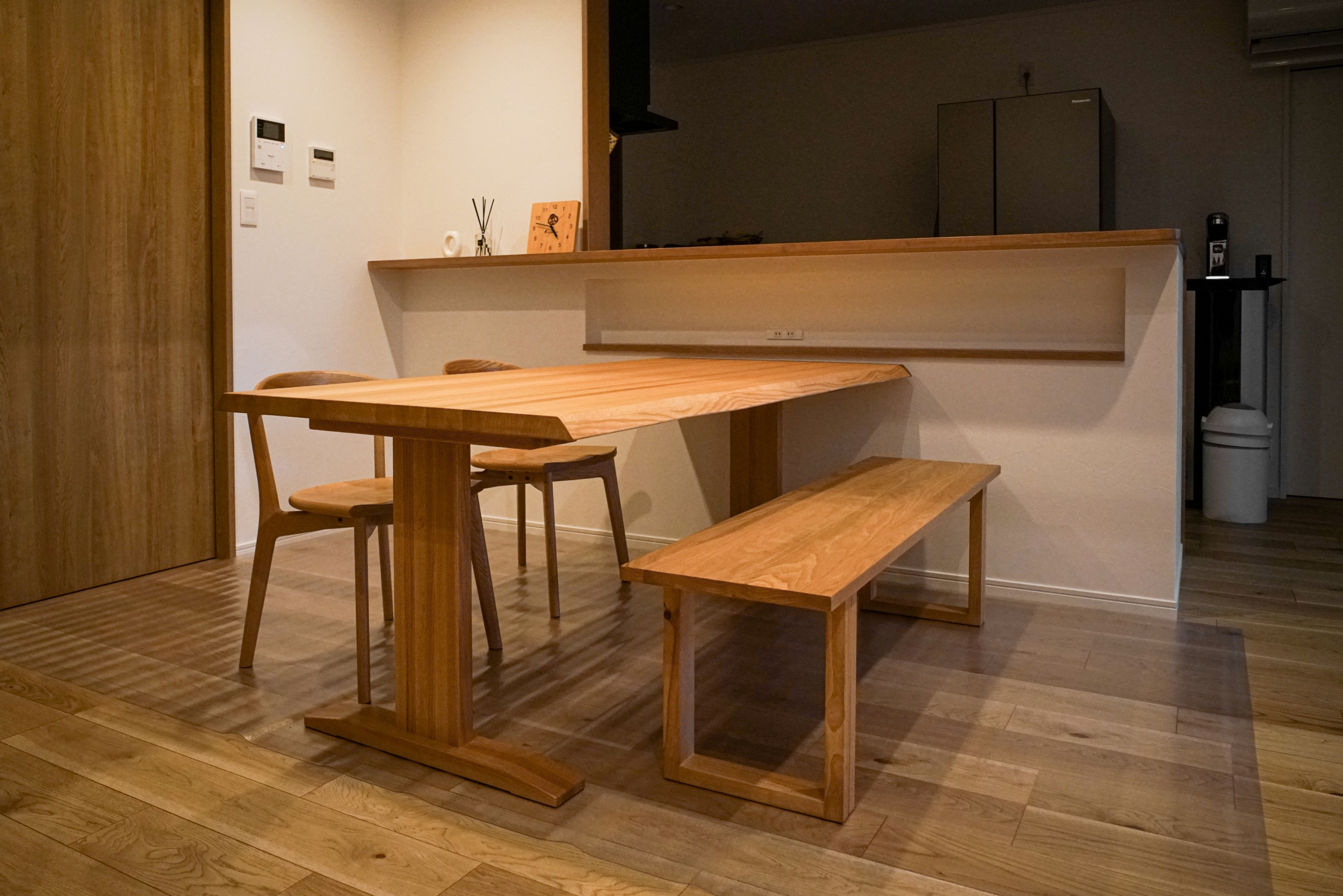 ナラ(オーク)無垢材のダイニングセットをお届けしました。厚み38ミリの天板を、自然な形状に削り出したこだわりの逸品です。椅子には線の細いデザインを合わせてお選びいただき、テーブルの迫力が際立つ組み合わせに仕上がりました。