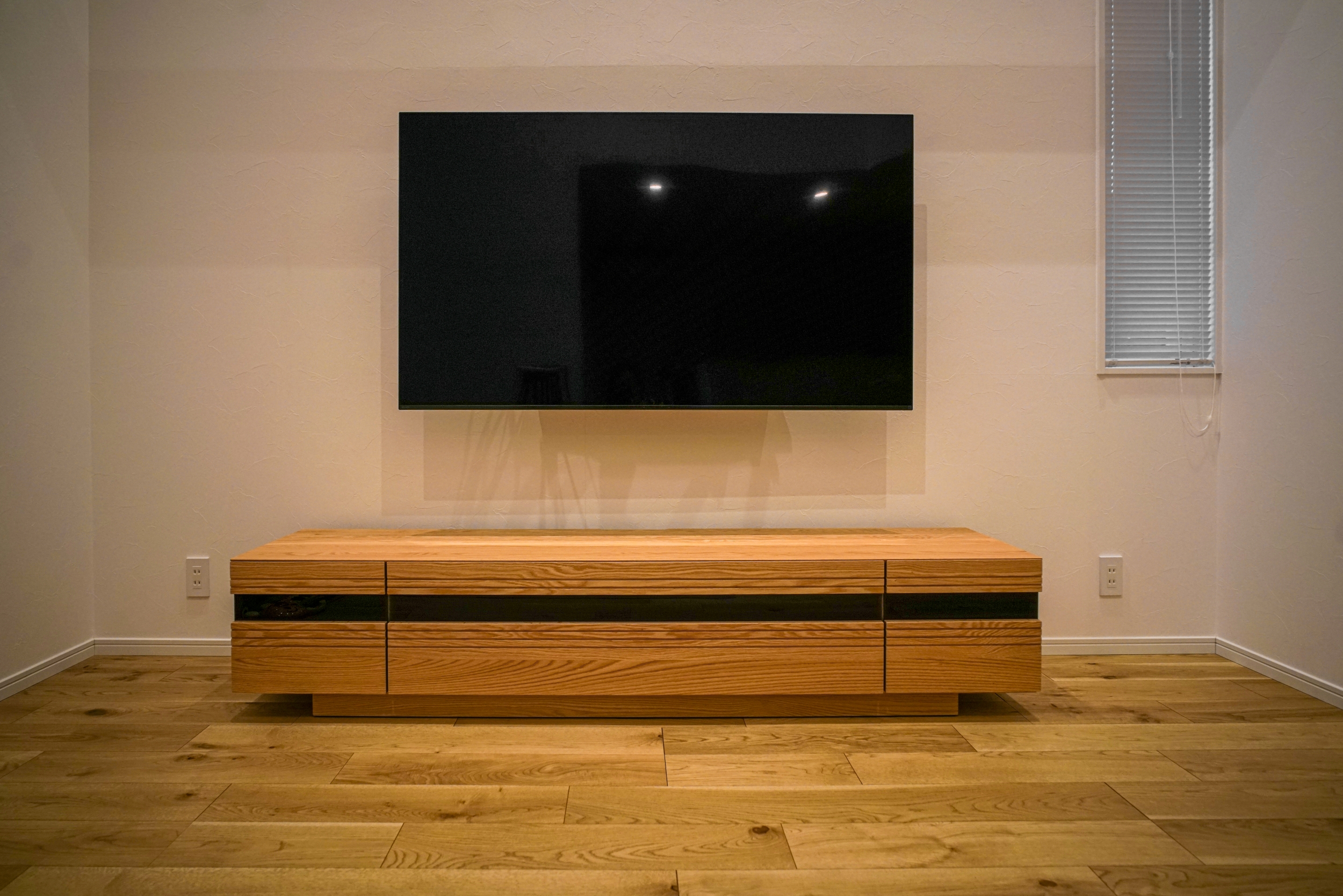 リビングスペースにも、ナラ(オーク)無垢材のテレビボードをお選びいただきました。幅2000ミリという大きいサイズで、壁掛けテレビの足元を迫力満点に飾ってくれます。横方向のスリットとブラックガラスがアクセントで効いていて格好いいですね!