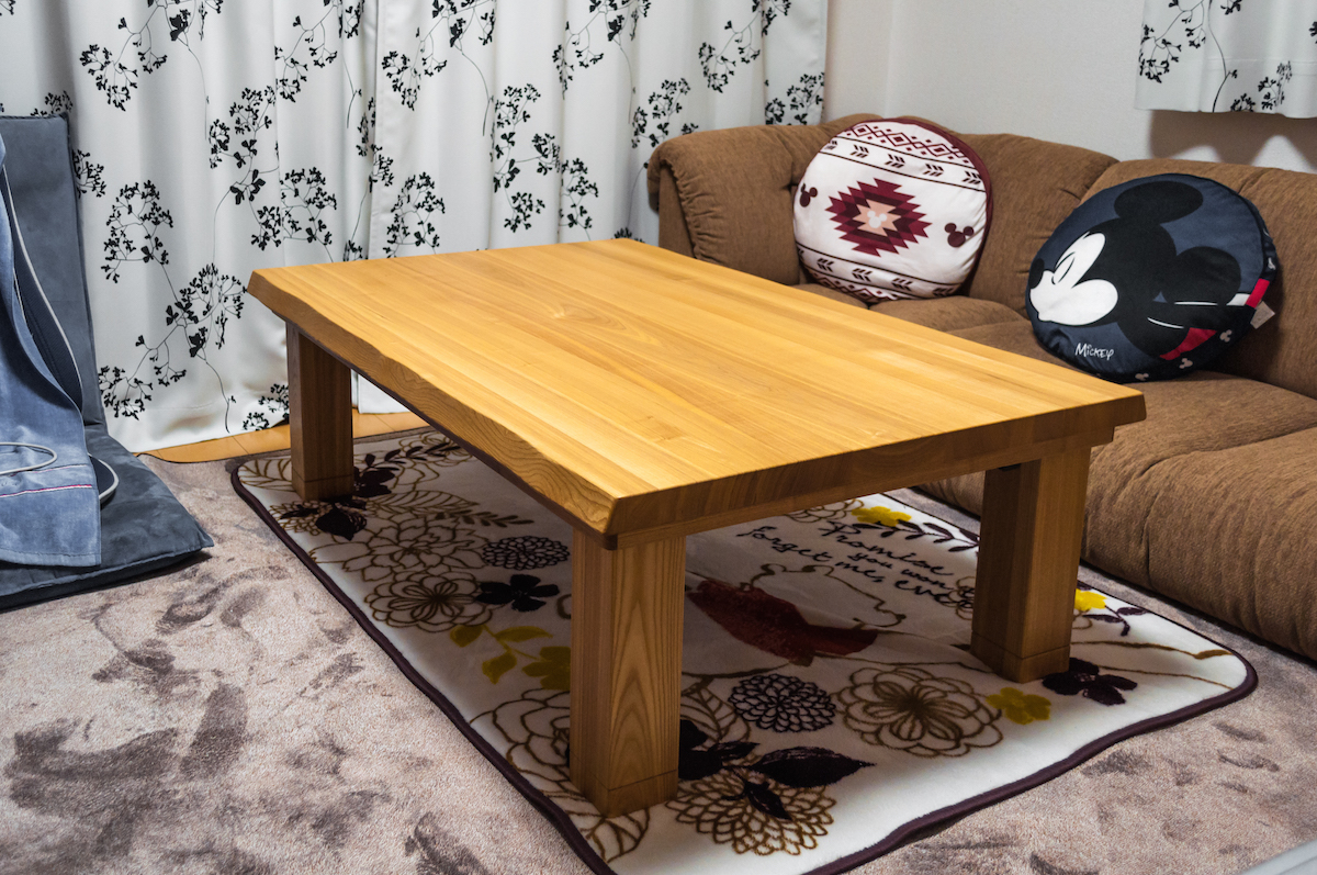 タモ(アッシュ)無垢材のこたつをお届けしました。 特殊な構造でつくられているため、ヒーターの熱でも無垢材の天板が反りにくくなっています。冬でも暖かく無垢材の質感を楽しめる優れものです☆
