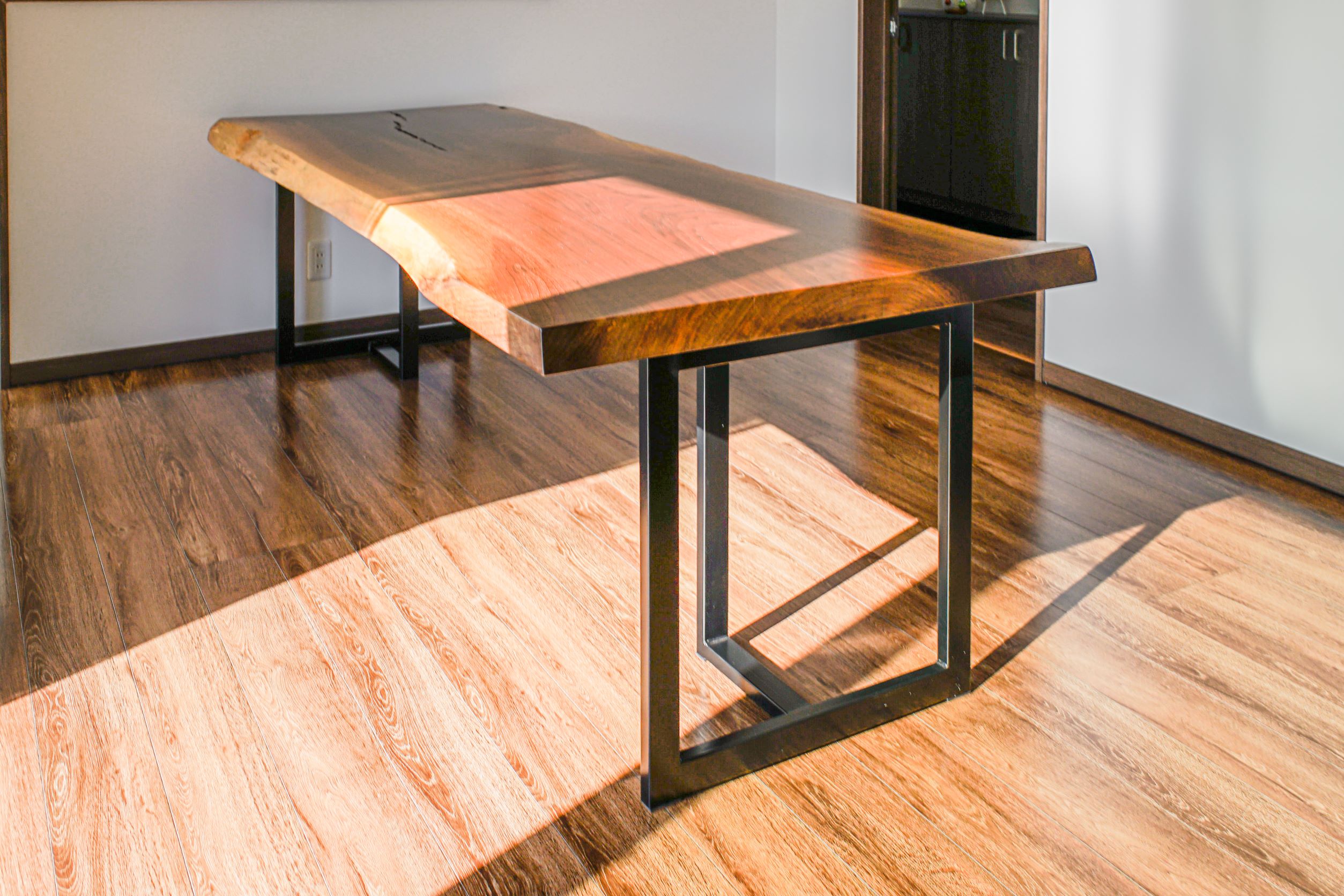 ブラックウォールナット一枚板のダイニングテーブルをお届けしました。厚みのある天板は幅2200ミリを超える大判サイズで大迫力です。左右の耳(樹皮の部分)も綺麗に残っており、写真の奥側に入ったウロがとても良いアクセントになっています。一枚板ならではの存在感と個性を楽しめる一品になりました。