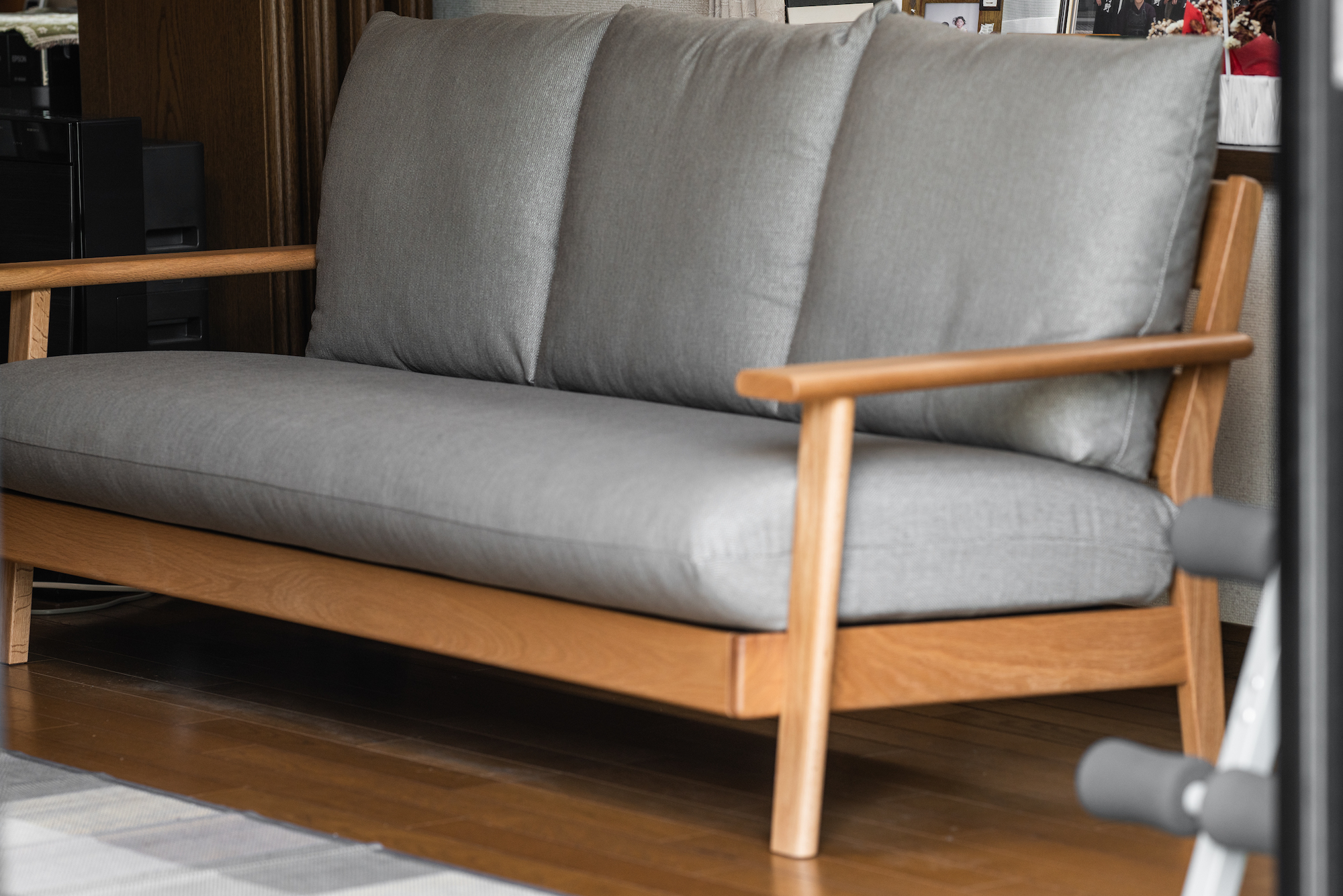 ナラ(オーク)無垢材のソファをお届けしました。落ち着いた色合いのカバーをお選びいただき、シックな雰囲気にまとまっています。ナラ材の明るい色目との相性もばっちりですね!