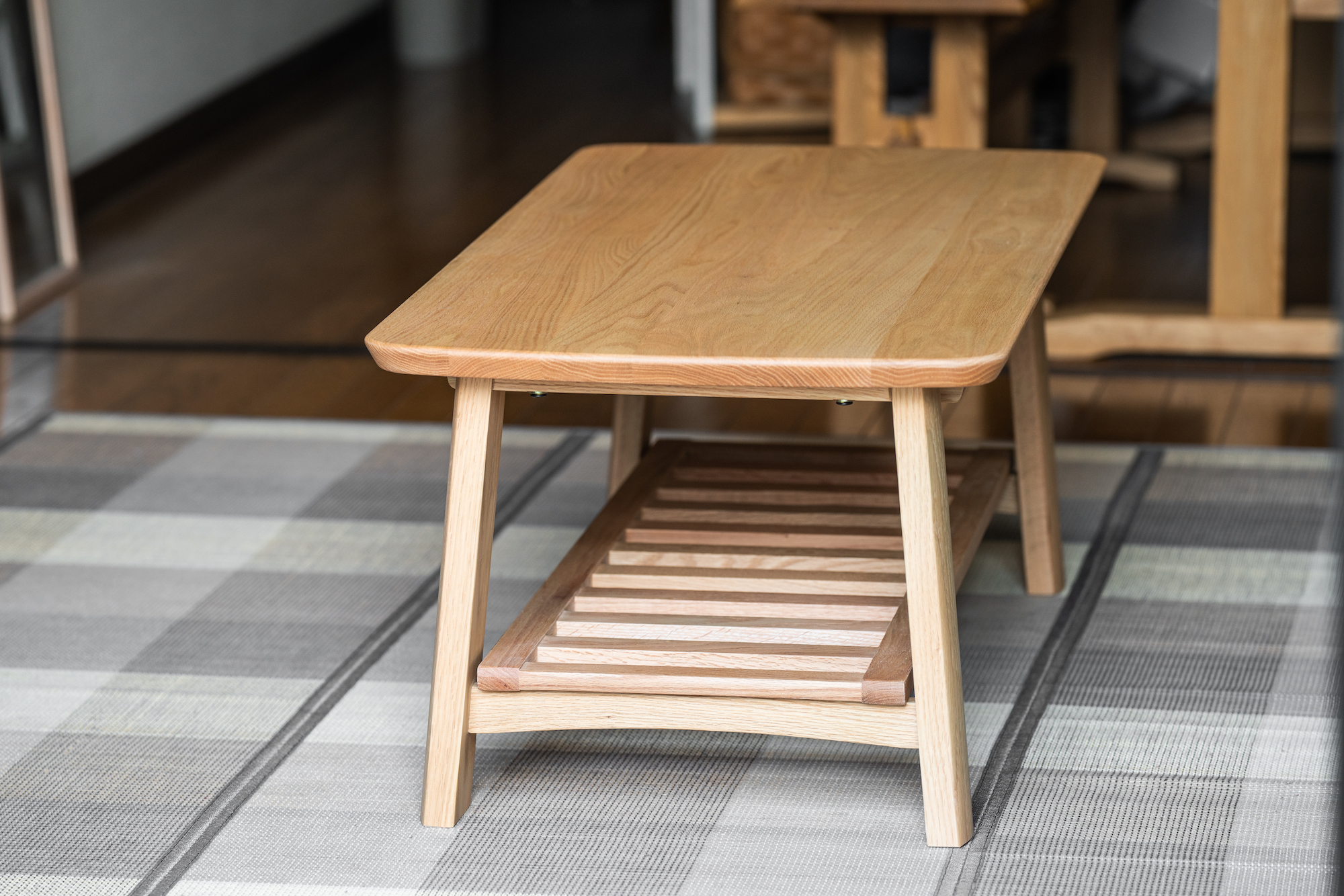 ソファの前には、同じくナラ材のセンターテーブルも合わせてお選びいただきました。棚板も付属していて、ちょっとした物を置く際も便利です。小ぶりな家具ですが、しっかりした存在感は無垢材ならではです。