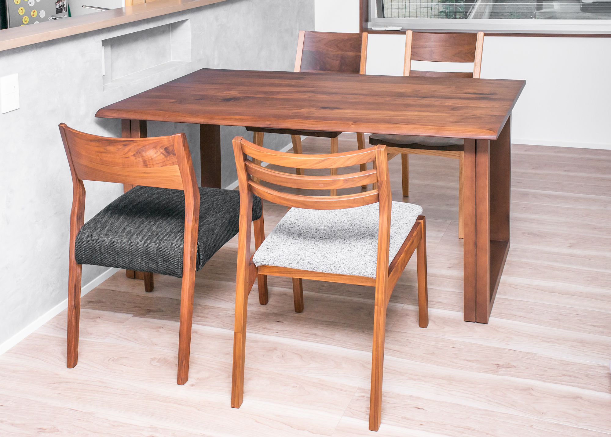 ブラックウォールナット無垢材のダイニングセットをお届けしました。削り出し加工を施した無垢材の質感たっぷりの天板に、椅子を4脚合わせてお選びいただきました。天然木ならではの高級感と、デザイン違いの椅子の賑やかさがほどよくミックスされた楽しげな空間に仕上がりました!