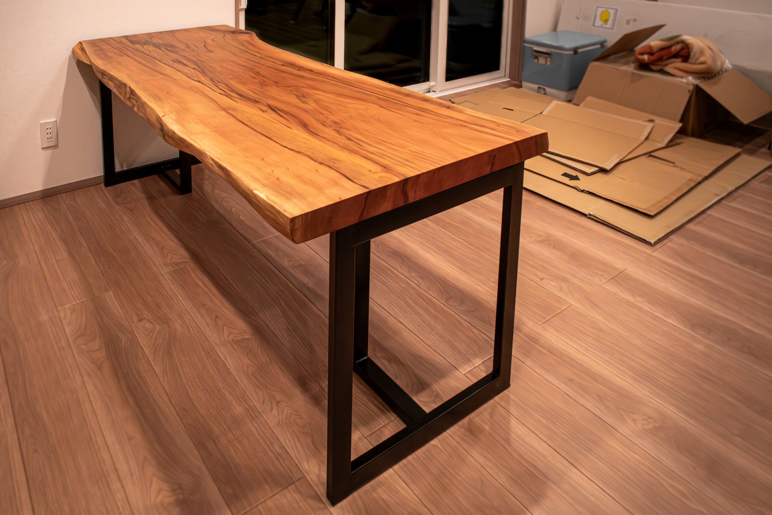 桂一枚板のダイニングテーブルをお届けしました。なかなか大判の板でお目にかかることがない桂の中でも、さらに全体的に赤みを帯びているのが特徴的な“緋桂(ひかつら)”と呼ばれる高級材料です。現在では一部の高級また板などの限られた用途にしか用いられていない希少な材料を、大迫力の一枚板で味わえる贅沢なダイニングテーブルに仕上がりました。