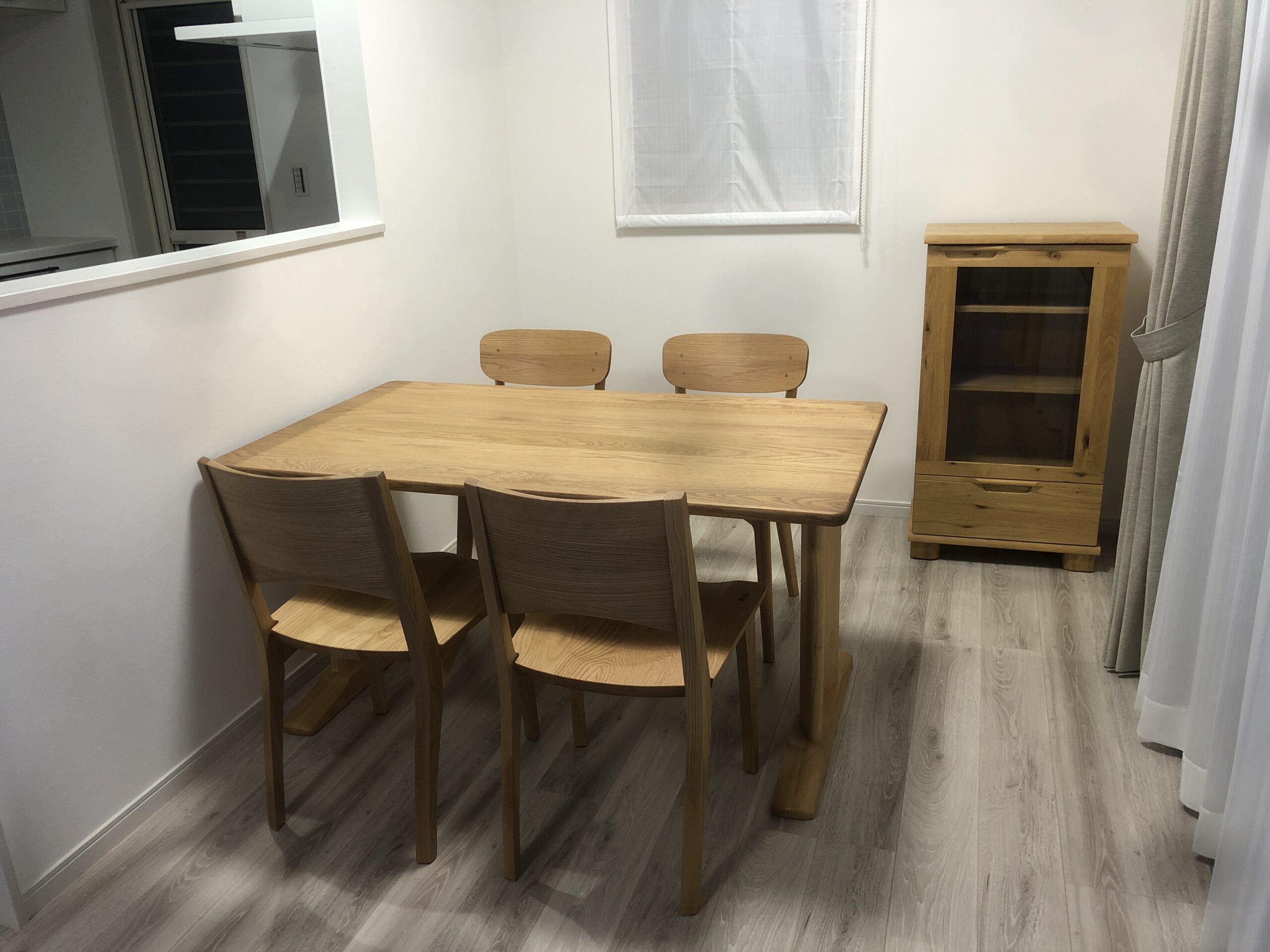 ナラ(オーク)無垢材のダイニングセットとキャビネットをお届けしました。テーブルには2脚ずつデザインの異なる椅子を合わせていただき、にぎやかな雰囲気にまとまりました。小ぶりなキャビネットも、リビング周りのちょっとした収納兼飾り棚としても使えるかわいらしいサイズ感です。