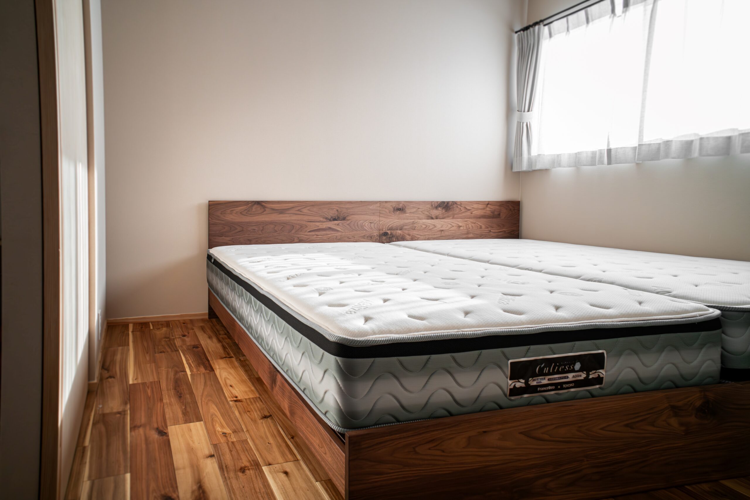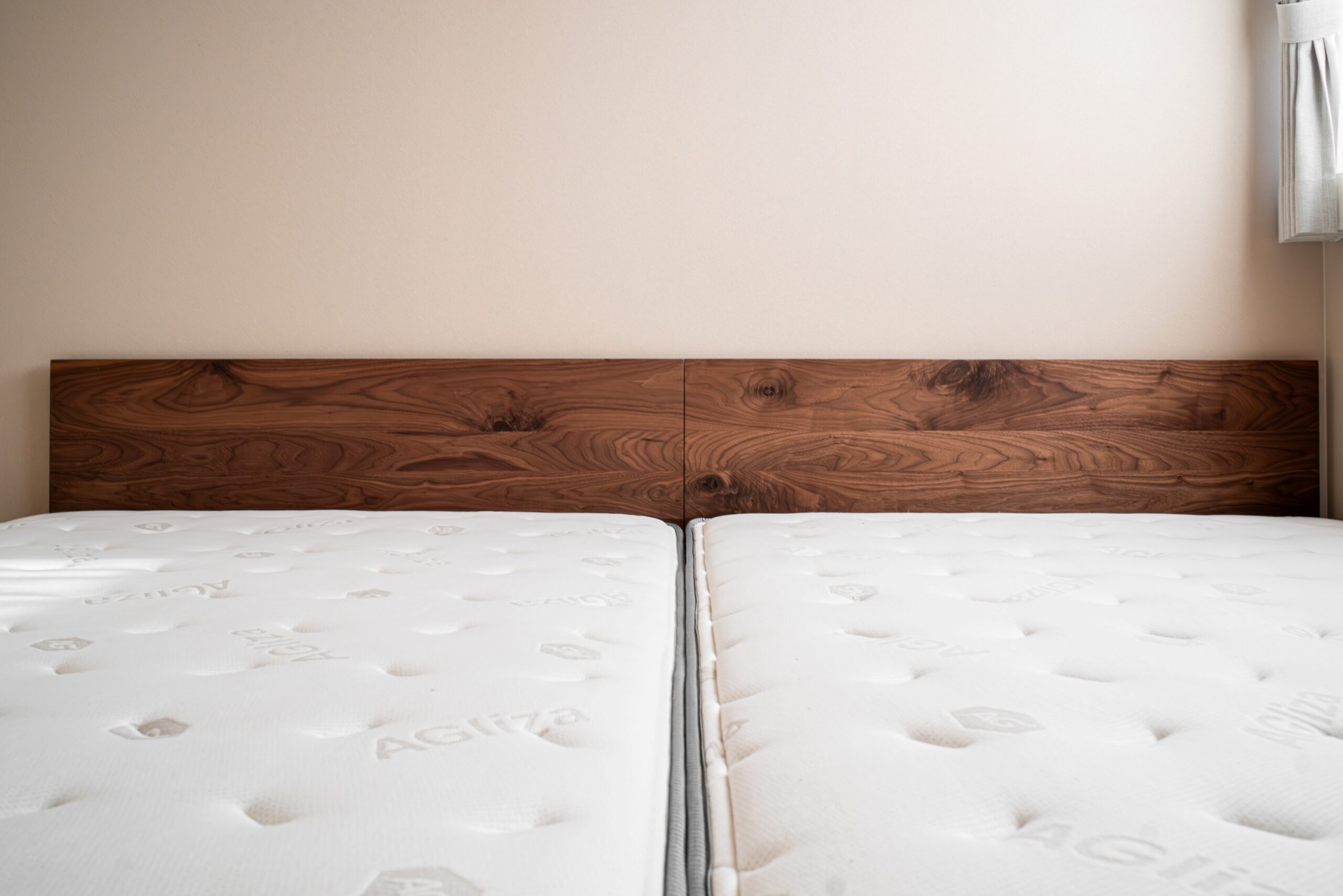 ブラックウォールナット無垢材のベッドフレームをお届けしました。探してみると意外とないシンプルなデザインで、無垢材ならではの質感の良さが際立ちます。セミダブルを2台並べて設置するため、ヘッドボードとフットボードは木目通し(1枚の大判の板をカットして製作し、左右で木目が通るように仕上げる手法)にてご用意しました。手間のかかる方法ではありますが、仕上がりの美しさは格別です!