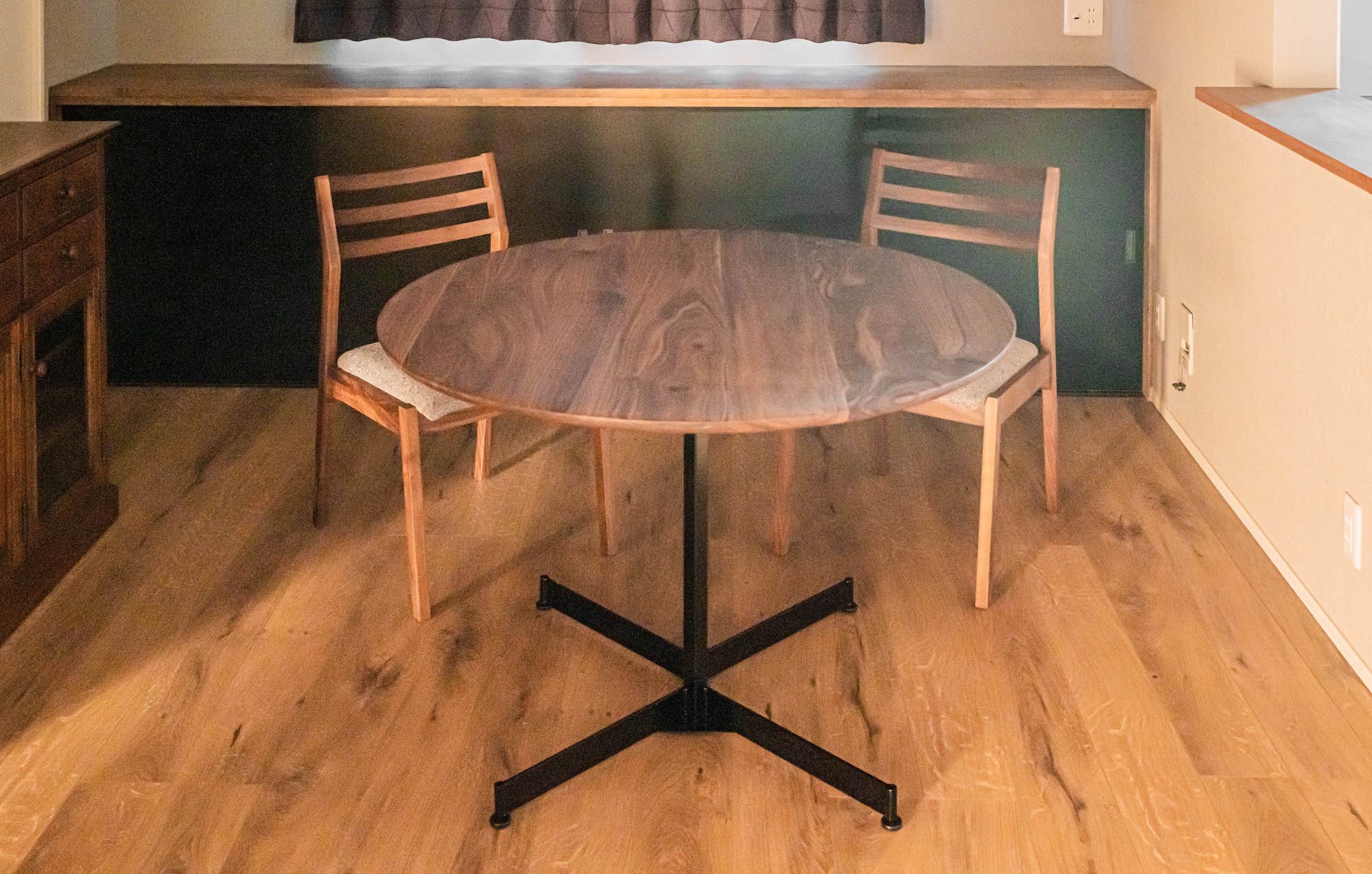 ブラックウォールナット無垢材のダイニングテーブルをお届けしました。4人でも使えるサイズの丸テーブルは、正方形に近い形状のお部屋では意外と省スペースで使えます。黒に近い色合いで仕上げられた建具と、素材の相性もばっちりですね!