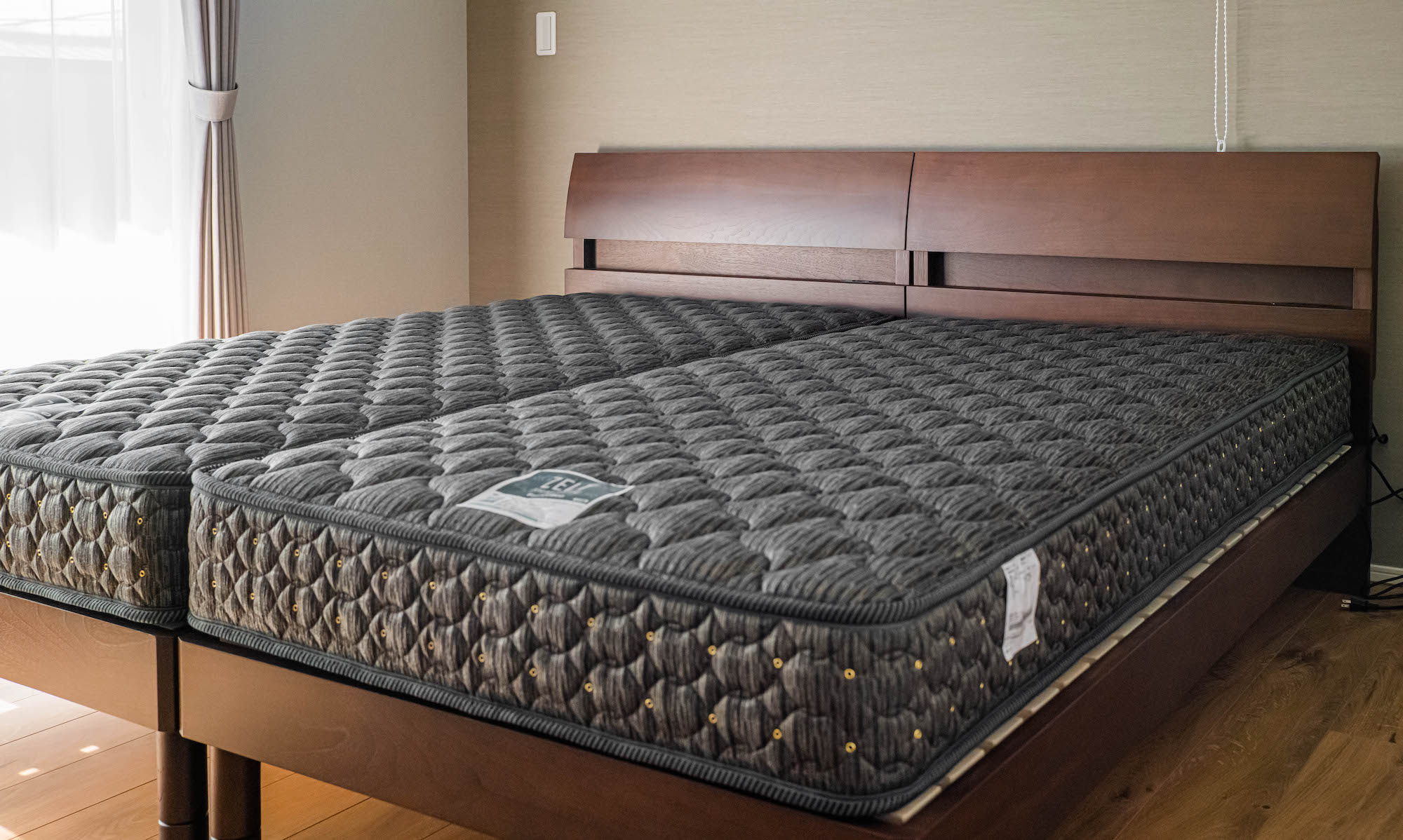 ベッドはシングルサイズを2台突き合わせて設置することで、継ぎ目が気にならず幅2000ミリの特大サイズと同じような感覚でお使いいただけます。ヘッドボードのちょっとした小物置きも、スマホやメガネをおいておくのに便利とご好評です。