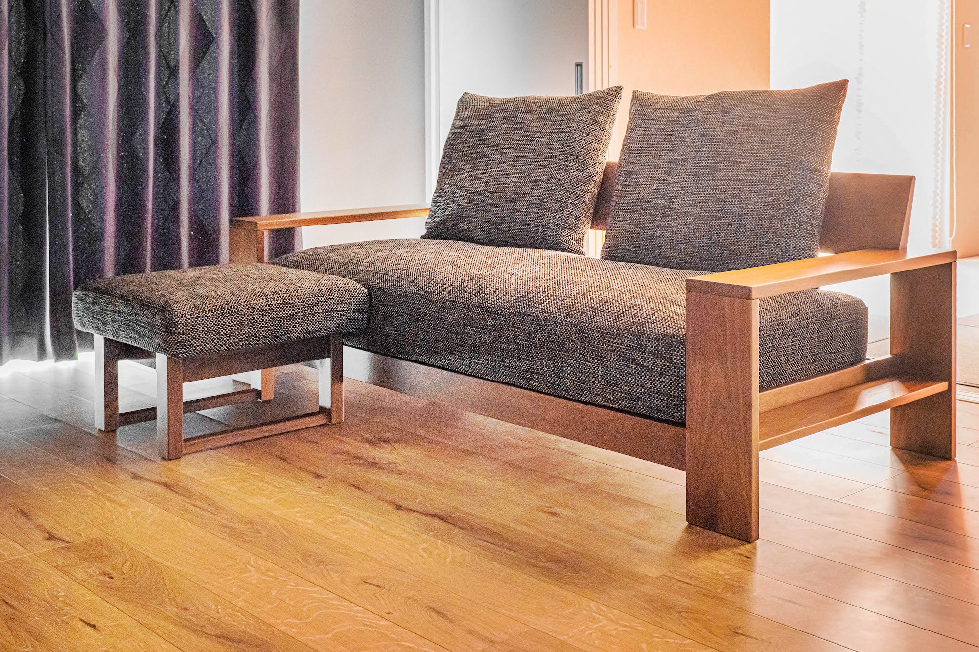 リビングスペースにはソファもお選びいただきました。3人掛けのゆったりサイズで、大人が横になっても寛げる広さです。幅広の肘は無垢材の存在感たっぷり!内装とコントラストをつけるために暗めで制作したカバーも良い雰囲気です。