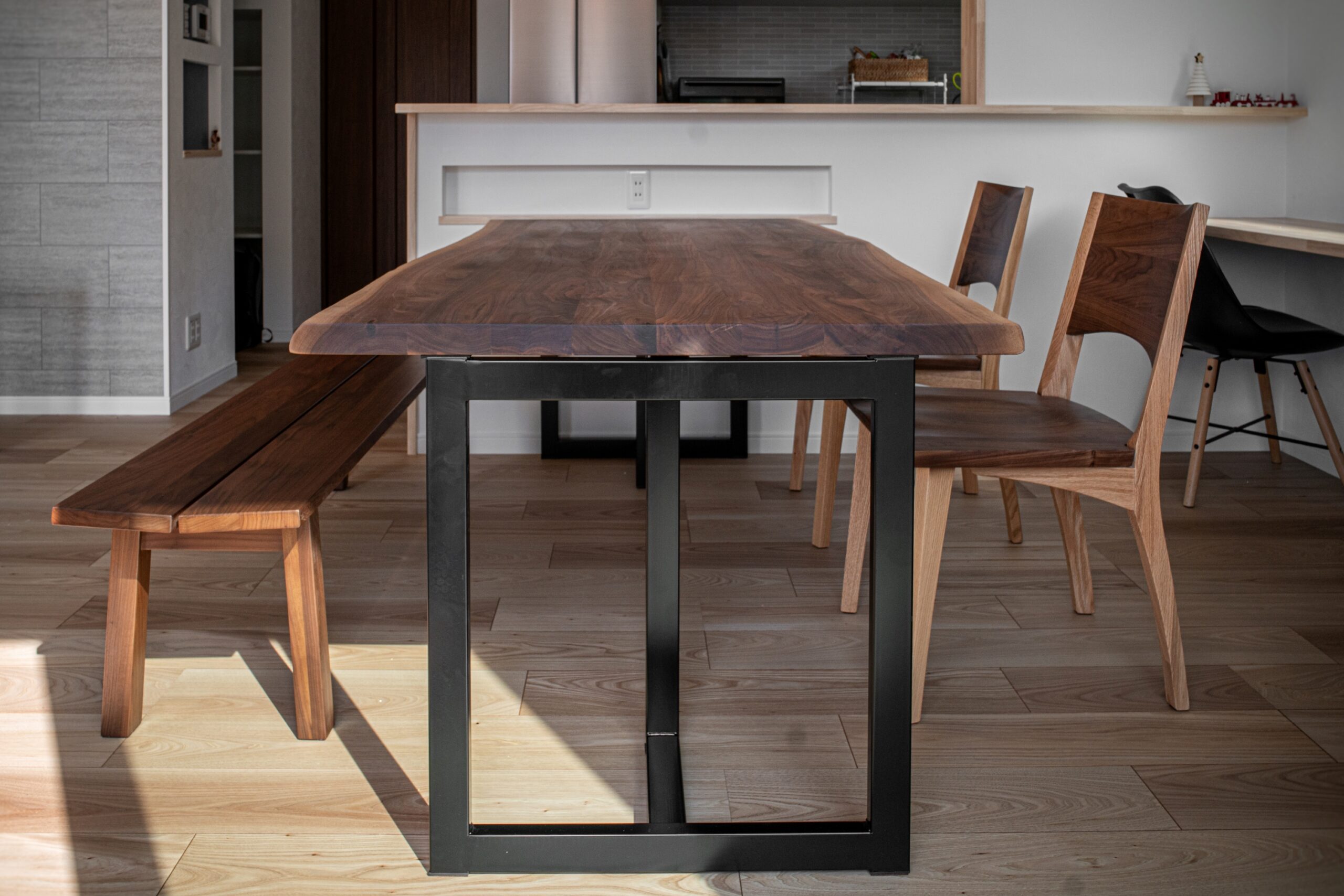 ブラックウォールナット無垢材のダイニングセットをお届けしました。テーブルの天板には“耳付き”と呼ばれる、丸太の樹皮の形状をそのまま活かした迫力の一枚をご用意しました。椅子は一部にオーク(ナラ)を配した仕様を合わせてお選びいただき、天板と合わせて自然なツートンカラーが綺麗な組み合わせに仕上がりました。