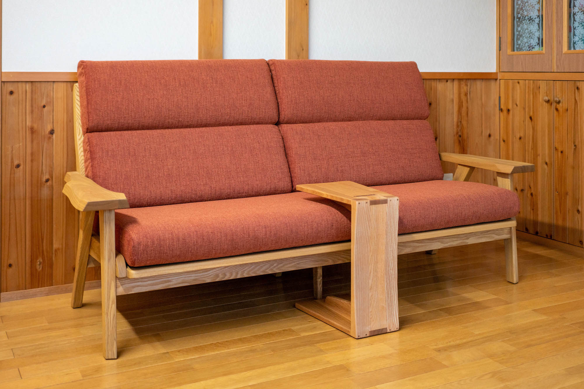 タモ(アッシュ)無垢材のソファ&サイドテーブルをお届けしました。落ち着いたオレンジ色のクッションは、あたたかみがあって無垢材に良く似合います。手元のサイドテーブルにお飲み物を置いたりしながら、ゆったりくつろいでいただける組み合わせになりました。