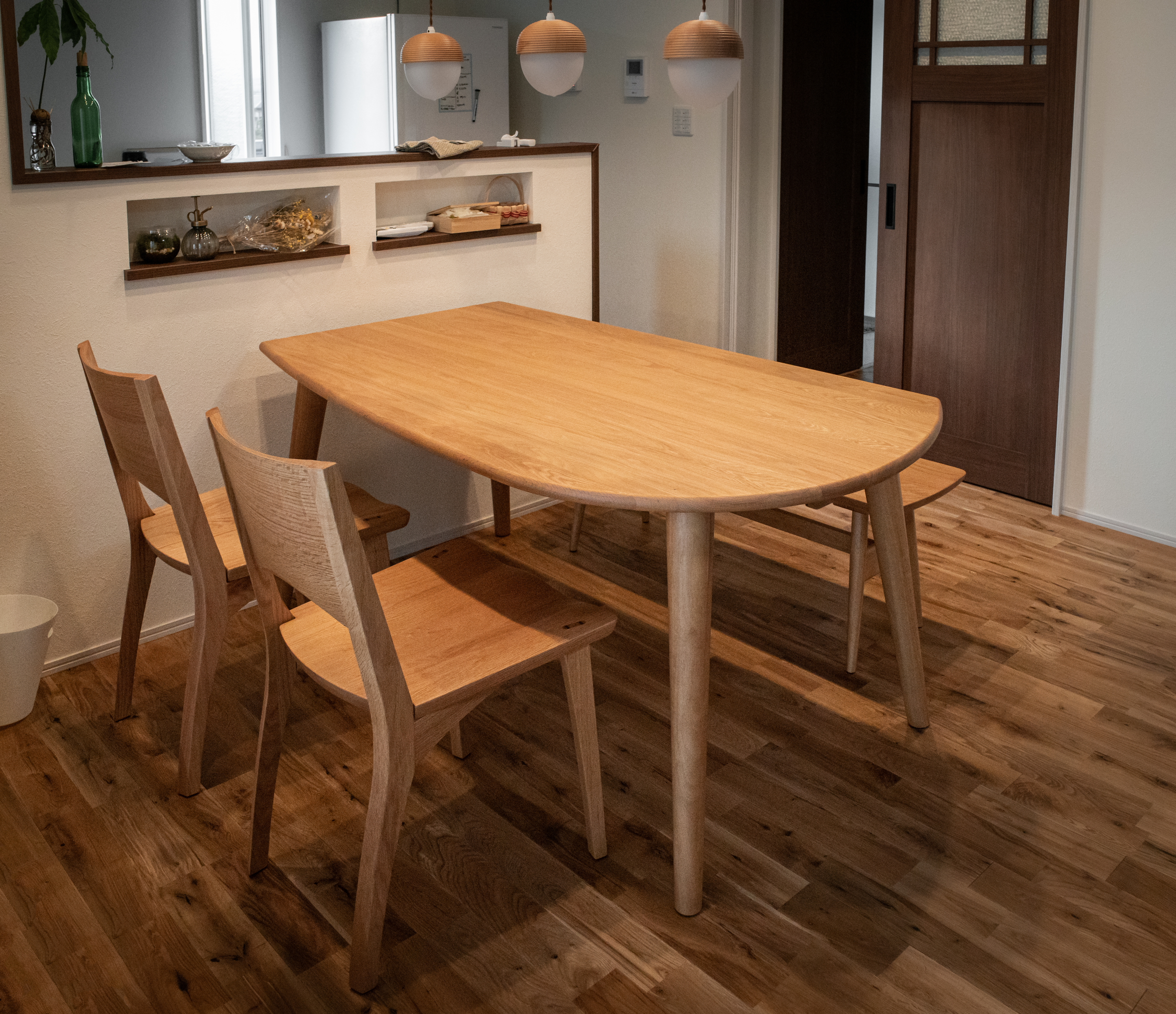 ナラ(オーク)無垢材のダイニングテーブルをお届けしました。無垢材ならではの曲線を帯びた柔らかいデザインで、高級感もありつつ可愛らしい印象にしあがりました。内装材やペンダントライトとの相性もばっちりですね!