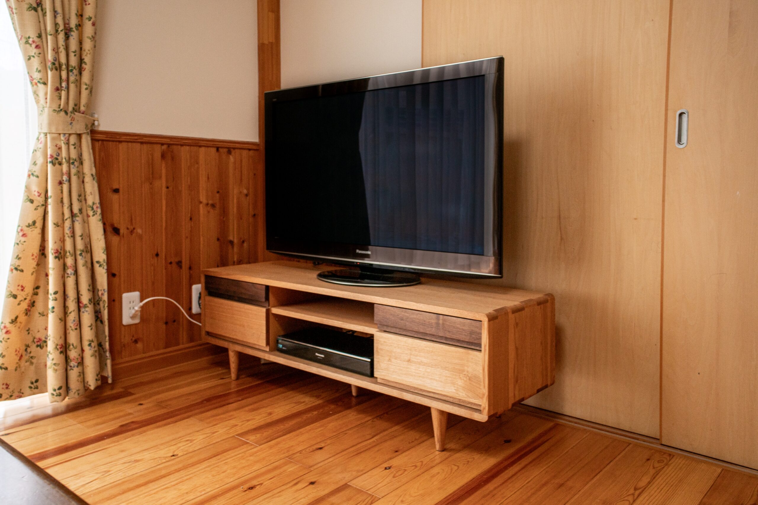タモ(アッシュ)無垢材のテレビボードをお届けしました。引出しの前板にブラックウォールナット無垢材を配しており、全体的に明るい印象ながら締まった雰囲気もあるテレビボードです。
