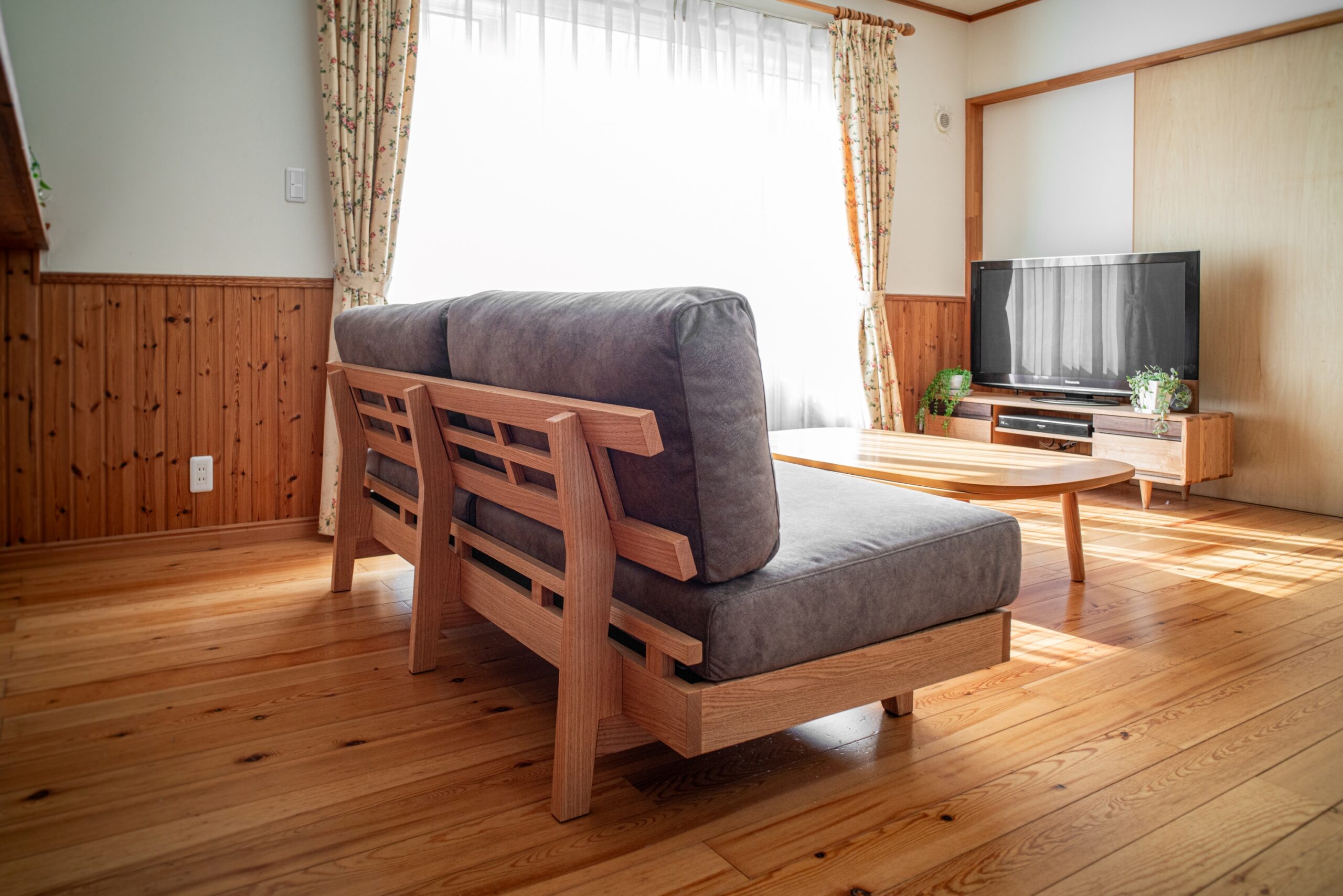 ナラ(オーク)無垢材のソファセットをお届けしました。アームレスタイプなので横幅=座面の有効幅となり、限られた空間でも圧迫感なくお使いいただけます。カバーは光沢感がある起毛素材の特注生地をお選びいただき、ボリュームの感じられる高級感のある仕上がりになりました。