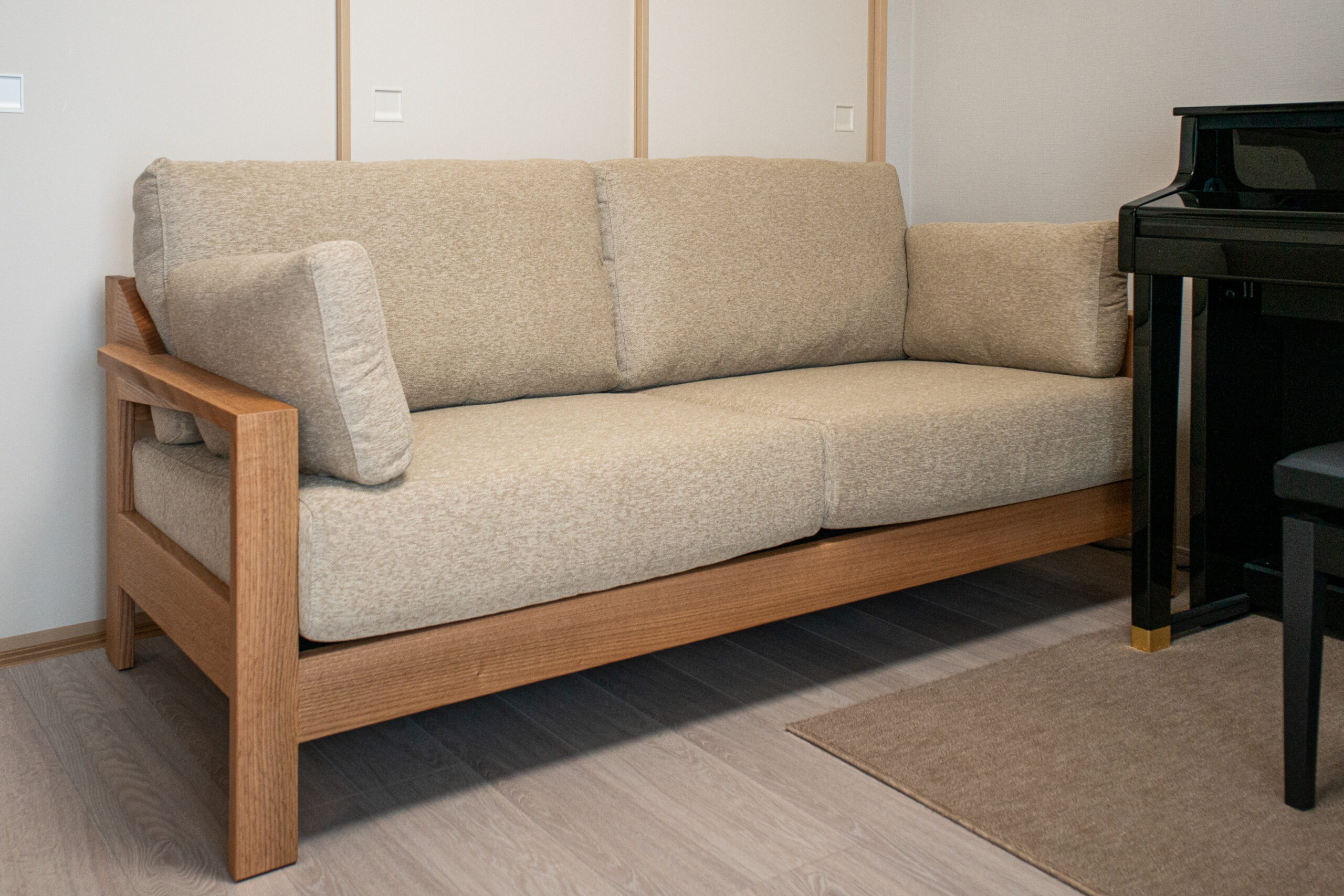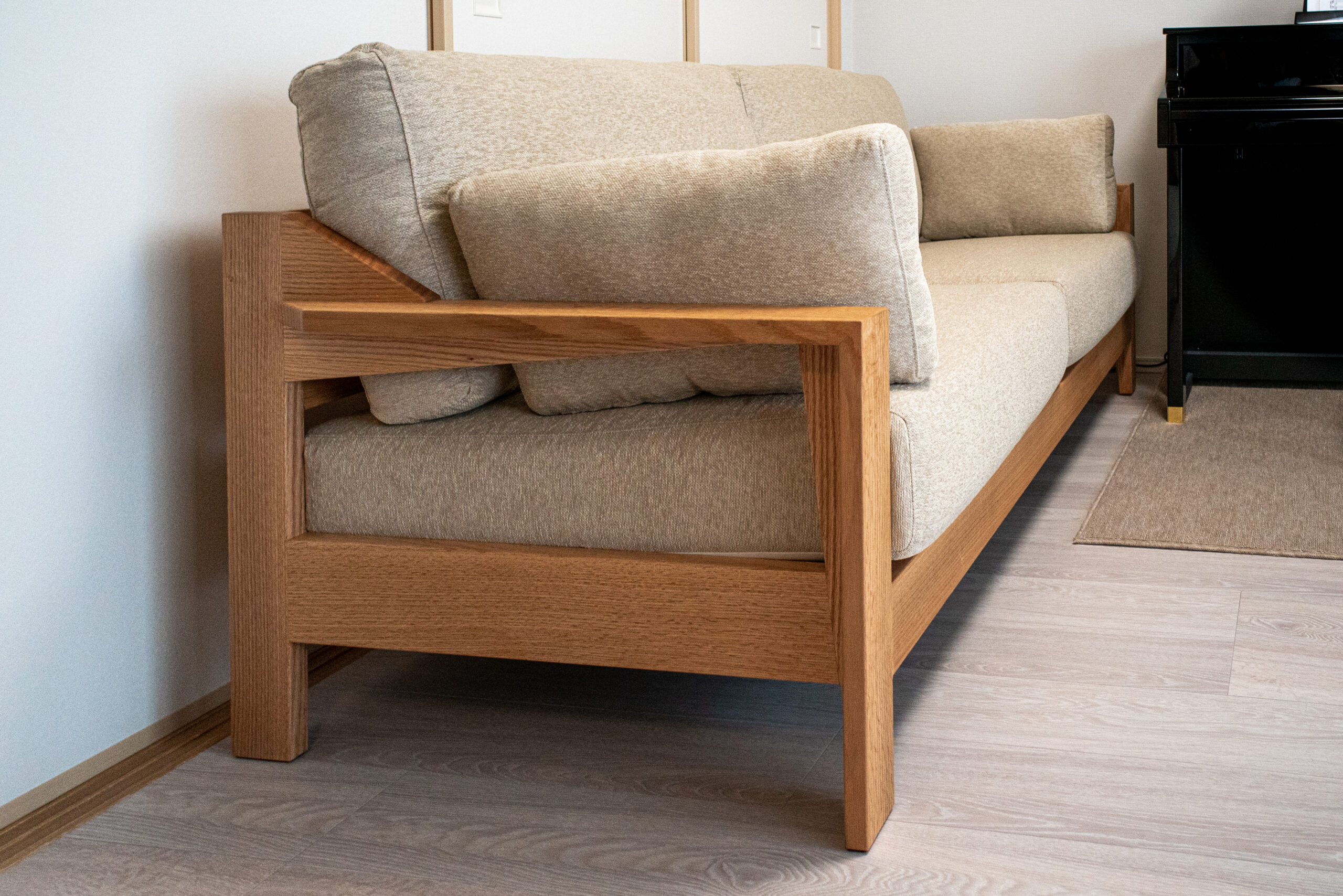 ナラ(オーク)無垢材のソファをお届けしました。厚みのある部材を贅沢に組み合わせたフレームは高級感たっぷり!クッションにはしっとりとした座り心地が特徴的な低反発素材を組み合わせており、長時間座っていただいても疲れをほとんど感じません。幅も1800ミリ以上と、寝転んで使っても気持ちの良いサイズ感で製作いたしました。
