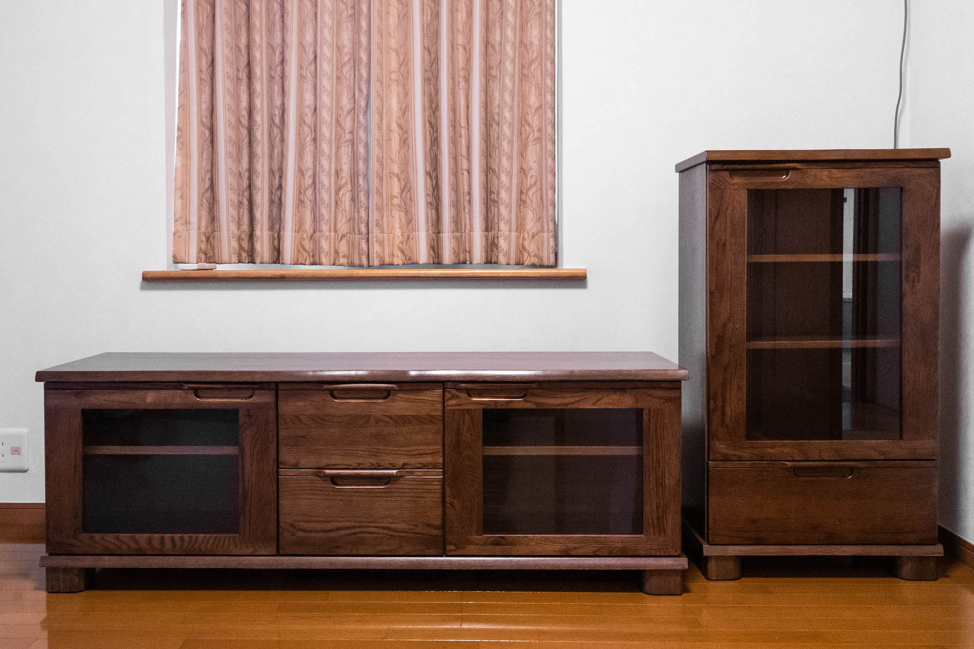 ナラ(オーク)無垢材のテレビボードとサイドボードをお届けしました。落ち着きのあるダーク色で合わせて、まとまりのある組み合わせでお選びいただきました。収納が不足しがちなリビング周りもばっちりカバーできる、頼もしいペアになりました。