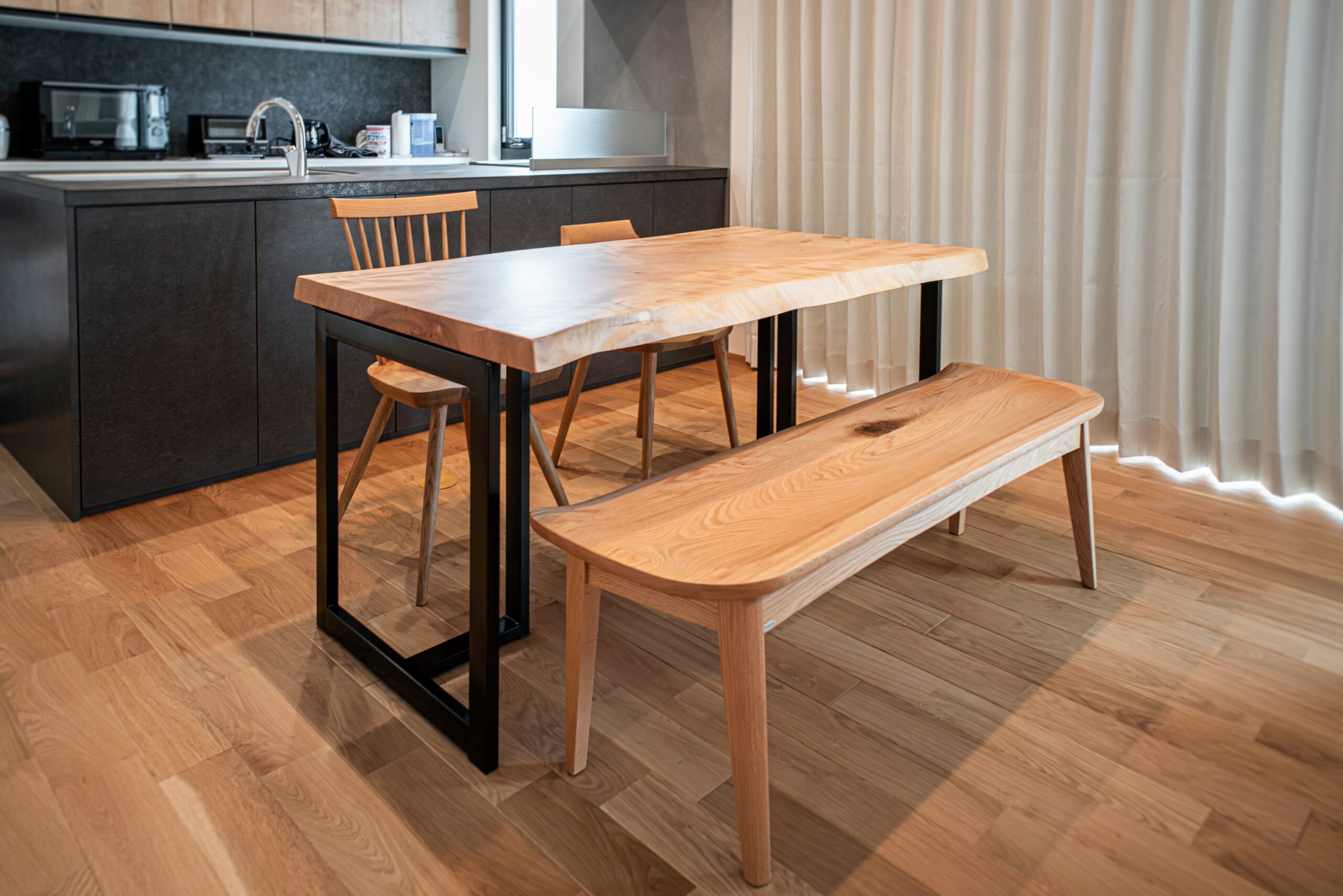 栃(トチ)一枚板のダイニングテーブルをお届けしました。数ある一枚板のなかでも際立って木肌が滑らかな栃は、「縮み杢」と呼ばれる独特のキラキラした模様が特長です。一枚板以外ではなかなか手に入らない高級材料ですが、サイズと見た目の印象を吟味してお選びいただきました。