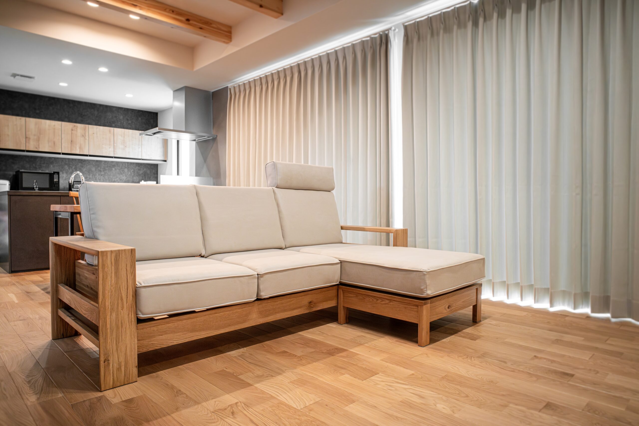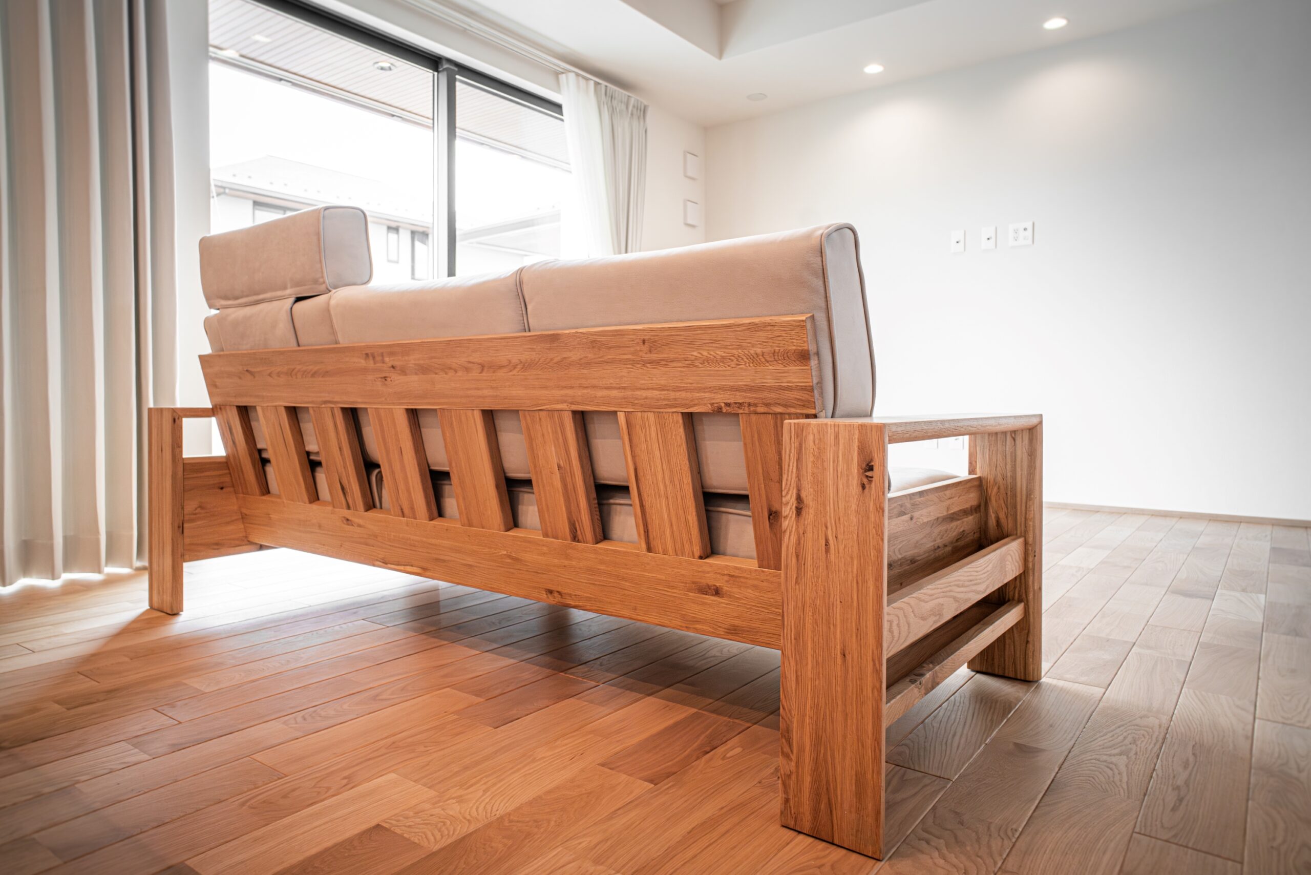 リビングスペースにはオーク無垢材のフレームのソファをお選びいただきました。幅広の材料をふんだんに使ったボリューム感が印象的な人気の製品です。ダイニングスペースから背もたれが良く見える位置でお使いいただくため、背面の仕上がりもデザインの大事なポイントです。