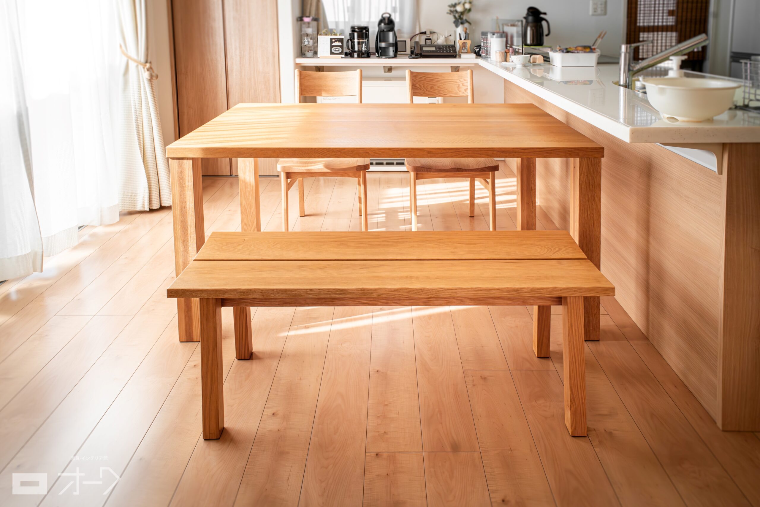 ナラ(オーク)無垢材のダイニングセットをお届けしました。テーブルや椅子の各部パーツには厚みある無垢材をふんだんに使っており、ボリューム感のある組み合わせに仕上がりました。シンプルなデザインゆえに、質感の良さがダイレクトに伝わります。