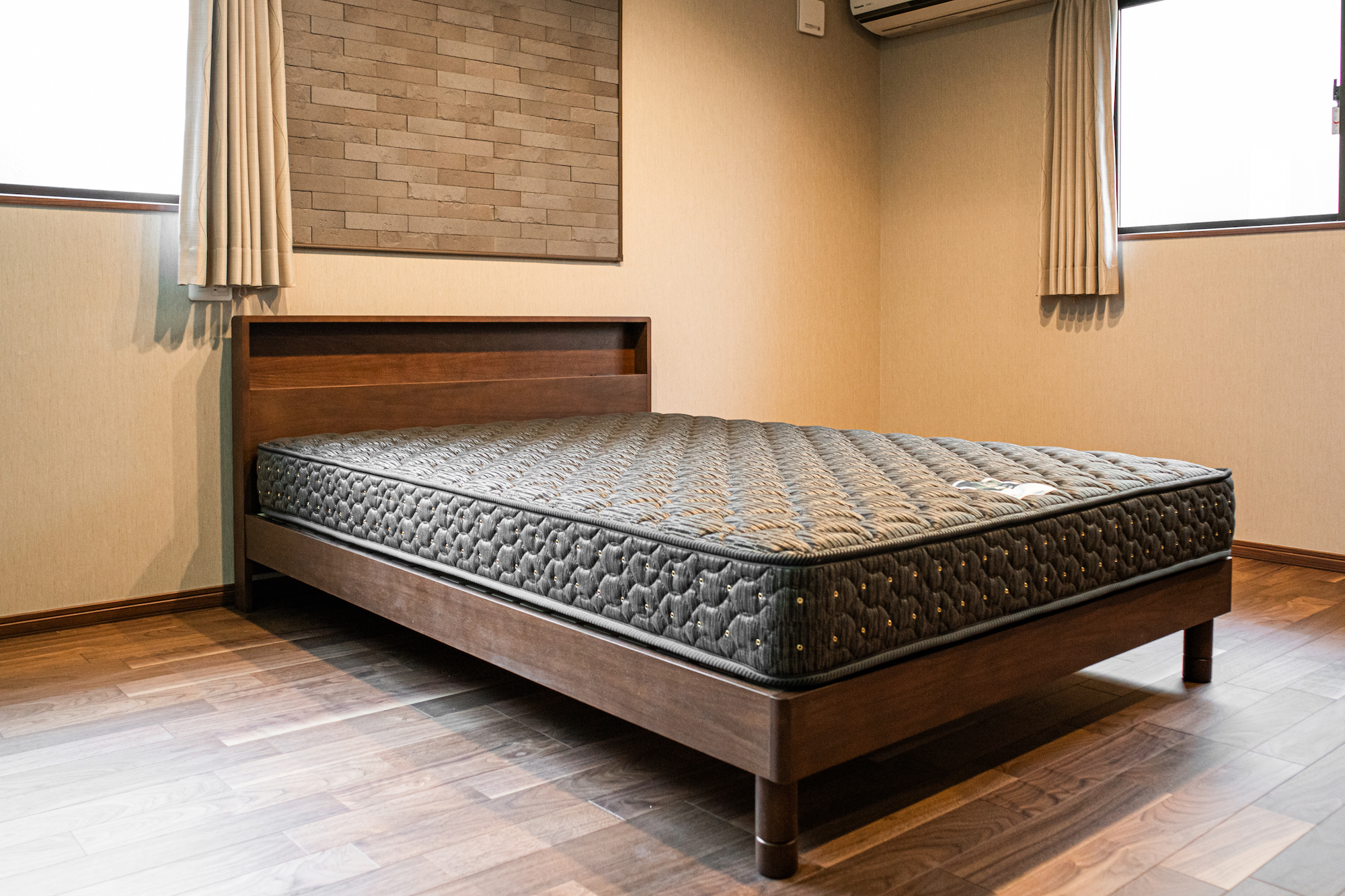 ブラックウォールナット材のベッドをお届けしました。広々とした寝室に合わせてダブルサイズをお選びいただきました。ヘッドボードにはコンセントも設けてあり、機能性もばっちりです。ブラックウォールナットの高級感が、デザインウォールの質感とも良く似合っていますね!
