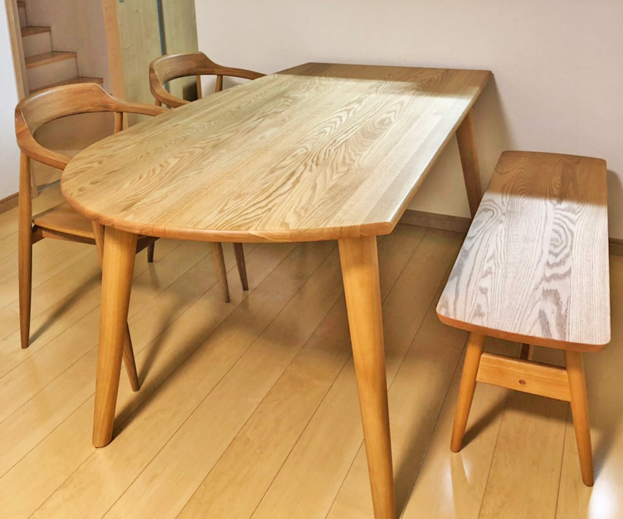 ナラ(オーク)無垢材のダイニングセットをお届けしました。変形の天板が可愛らしいテーブルと、丸みを帯びた椅子がよく似合います。大人数で囲むのにも適した形で、ご親族や友人が集まった時も安心です。