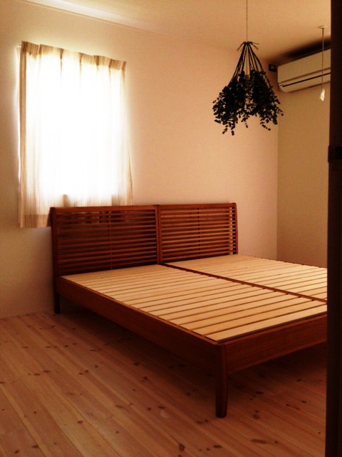 天井から下げられたグリーンがアクセントになって、ナチュラルな雰囲気にタモ材のフレームが良く合います♪