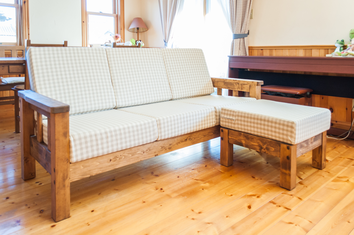 パイン無垢材のソファをお届けしました。フローリングや腰壁、ダイニングテーブルなどもパイン材で統一された、温もりに満ちたとっても素敵なお部屋に迎えていただきました。ダークブラウンのオイル塗装のフレームにベージュのチェックカバーを合わせてお選びいただき、大人っぽい落ち着いた雰囲気に仕上がりました。