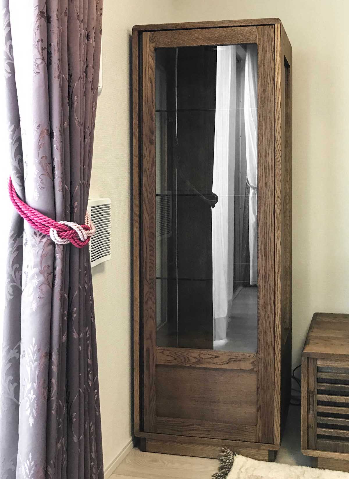 タモ(アッシュ)無垢材のキュリオケースをお届けしました。コレクションされている食器類を飾られるとのことで、ガラス張りの造りは相性もぴったり!隣のテレビボードと同じ材質・仕上げで揃えて、統一感のあるリビングスペースになりました。