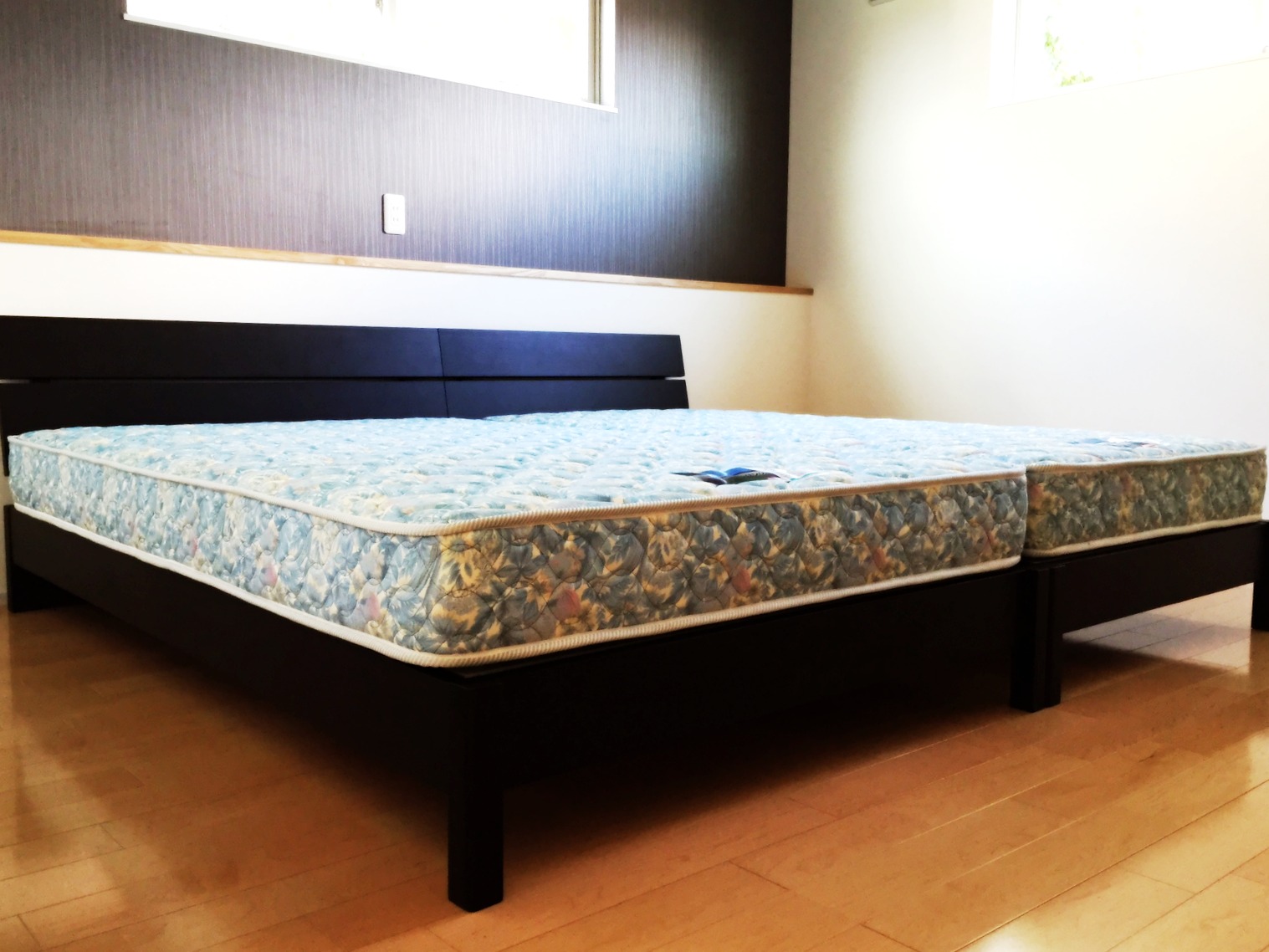 シングルをお2つですが、干渉しないようにぴったり合わせて置いてダブルベッドのようにも使えます。