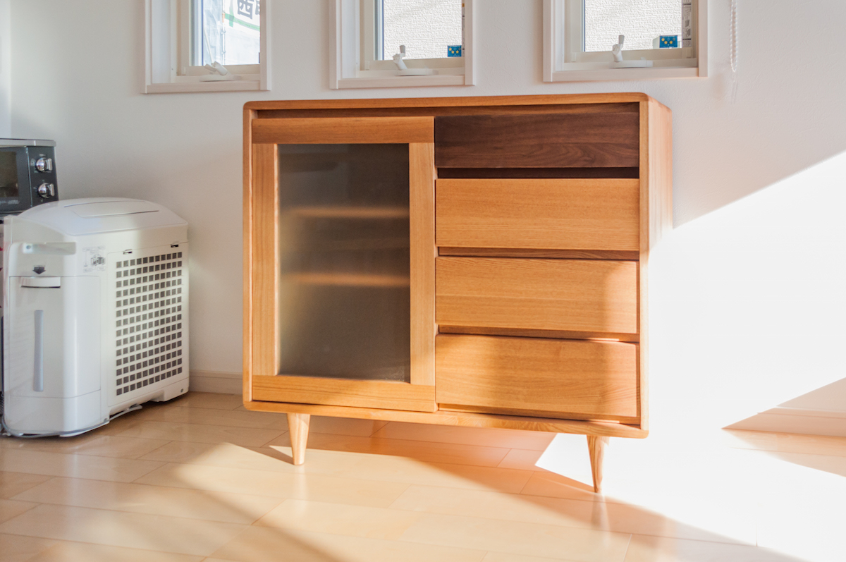 こちらは、タモ(アッシュ)材にブラックウォールナット材を組み合わせたサイドボードです。