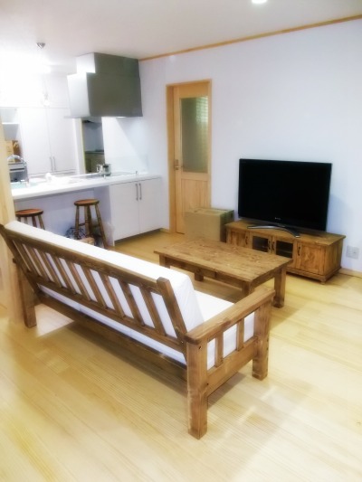 パイン無垢材のリビングセットと、キッチンカウンターに合わせるハイスツールのセットをお届けしました。