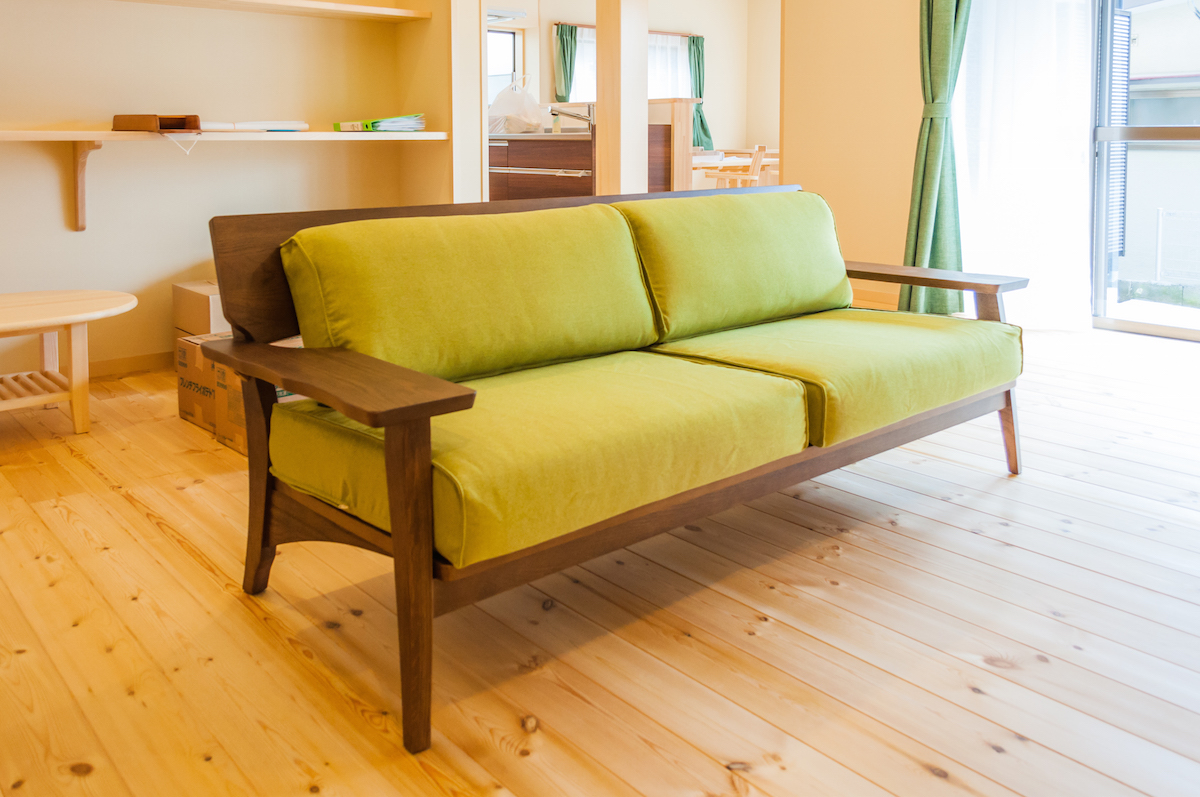 ナラ(オーク)無垢材のソファをお届けしました。明るいトーンを基調としたお部屋に、ダーク色のフレームが引き締め役で際立っています♪クッションカバーには若草色をお選びいただき、優しい雰囲気にまとまりました☆