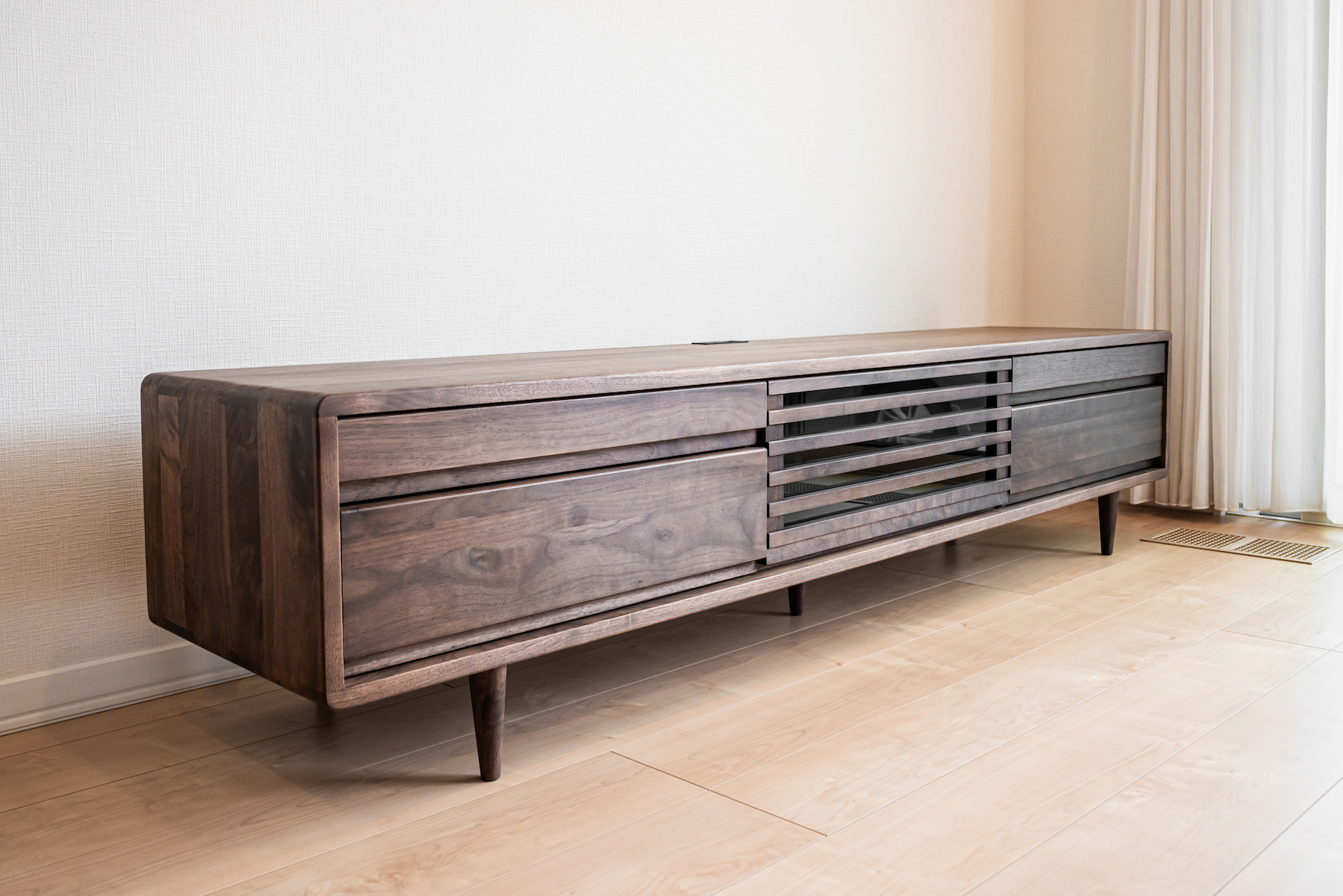 テレビボードもブラックウォールナット無垢材でご指定いただきました。もともとはアッシュ材との組み合わせでツートンカラーにて始まったモデルですが、最近ではブラックウォールナット一色でのオーダーもとても多くいただくようになりました。