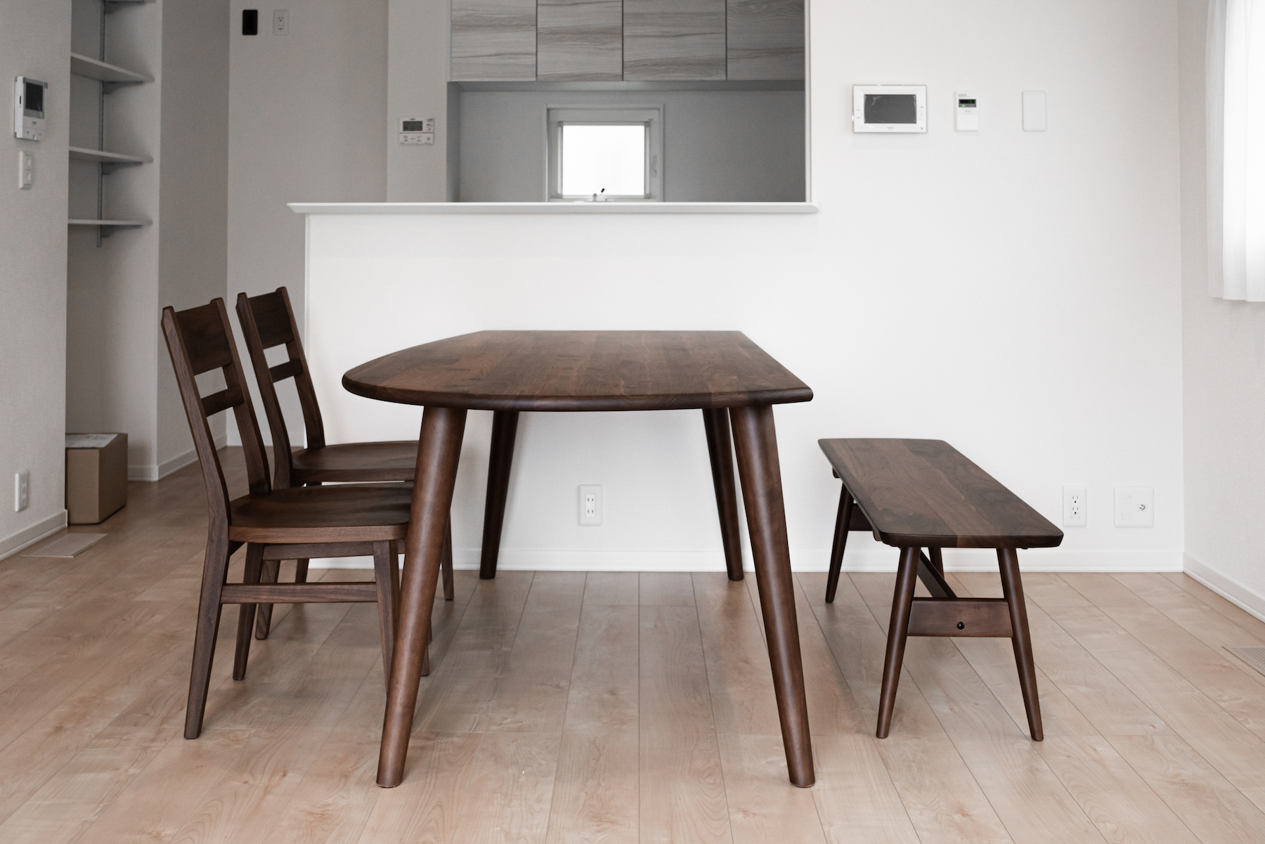 ブラックウォールナット無垢材のダイニングセットをお届けしました。無垢材ならではの変形天板がかわいらしい一品です。椅子とベンチも素材を合わせてお選びいただき、統一感がある仕上がりになりました。