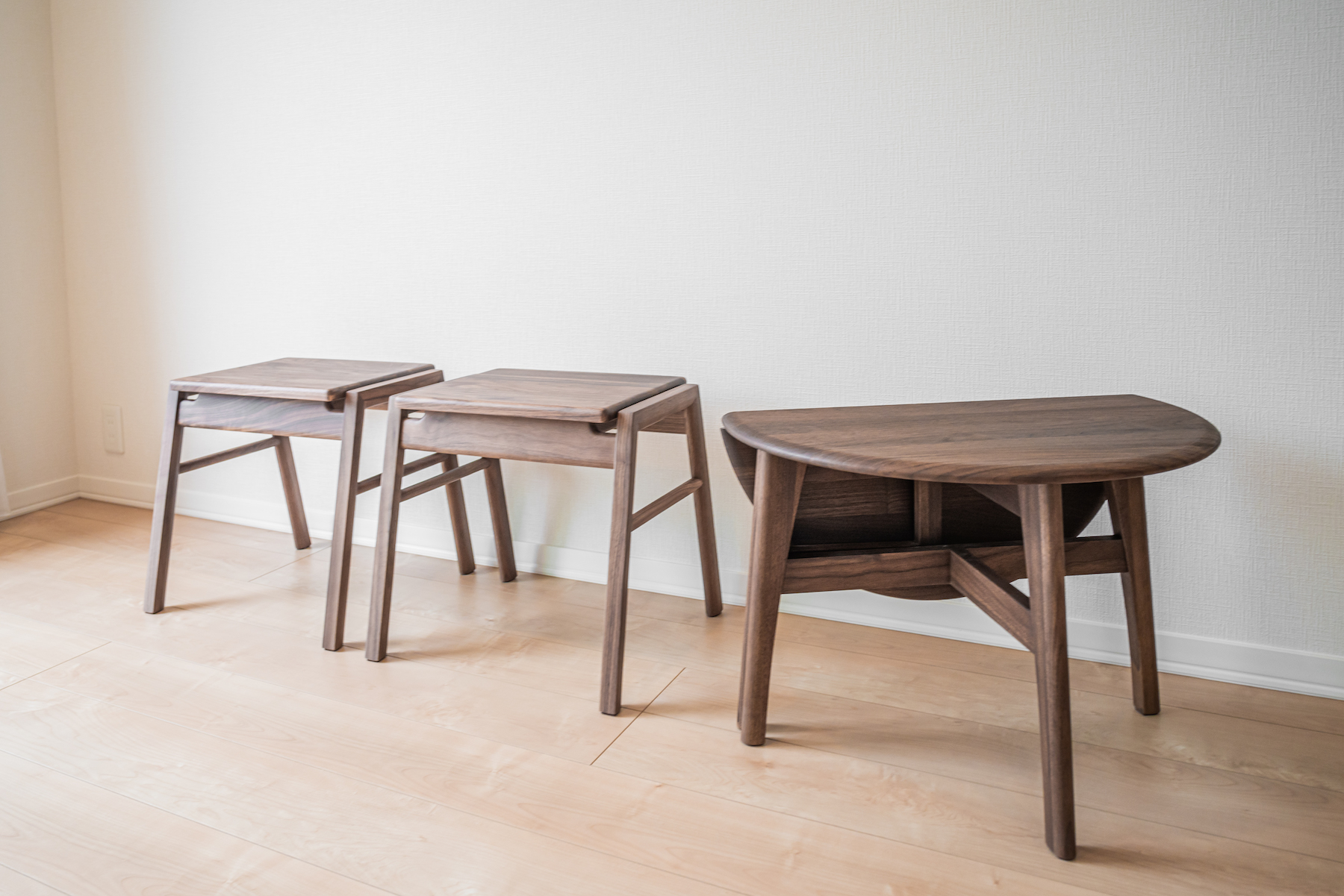 スツールやサイドテーブルなどの小物も、ブラックウォールナット無垢材で揃えていただきました。ホワイトを基調としたお部屋と、高級感たっぷりのダークブラウンは相性抜群です。小ぶりながらしっかりした造りで、長くご愛用いただける家具たちです。